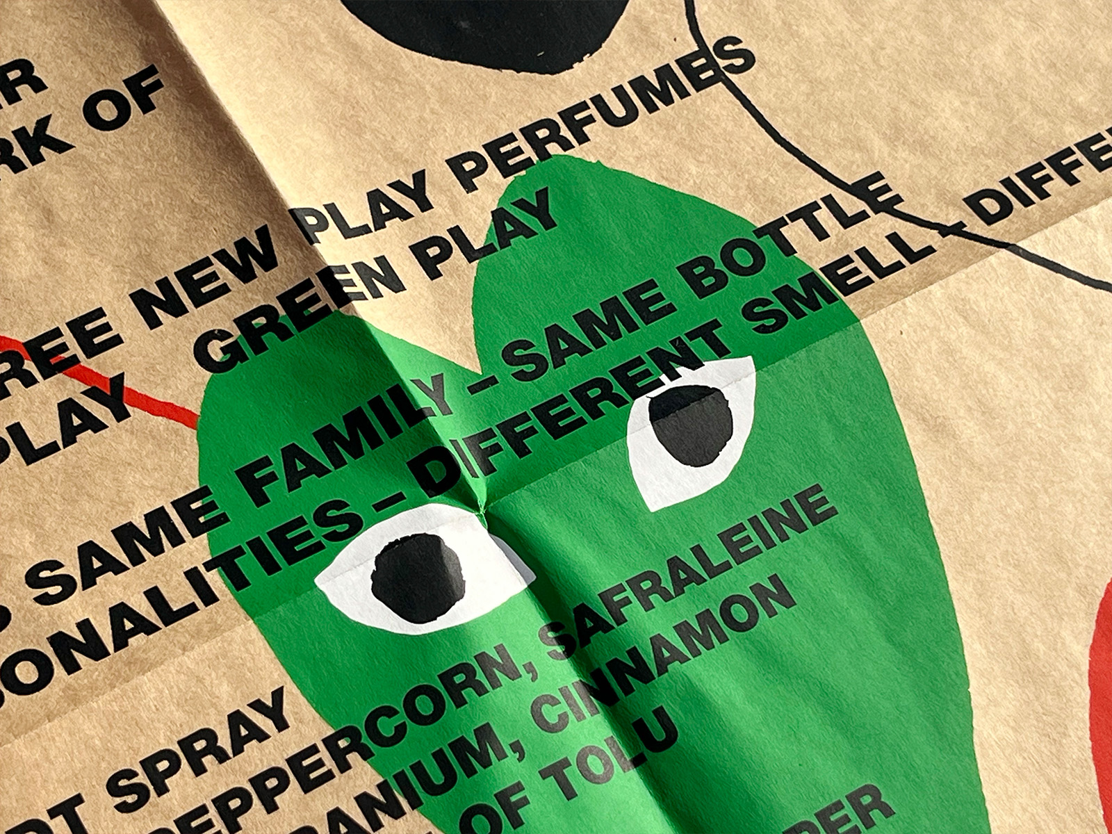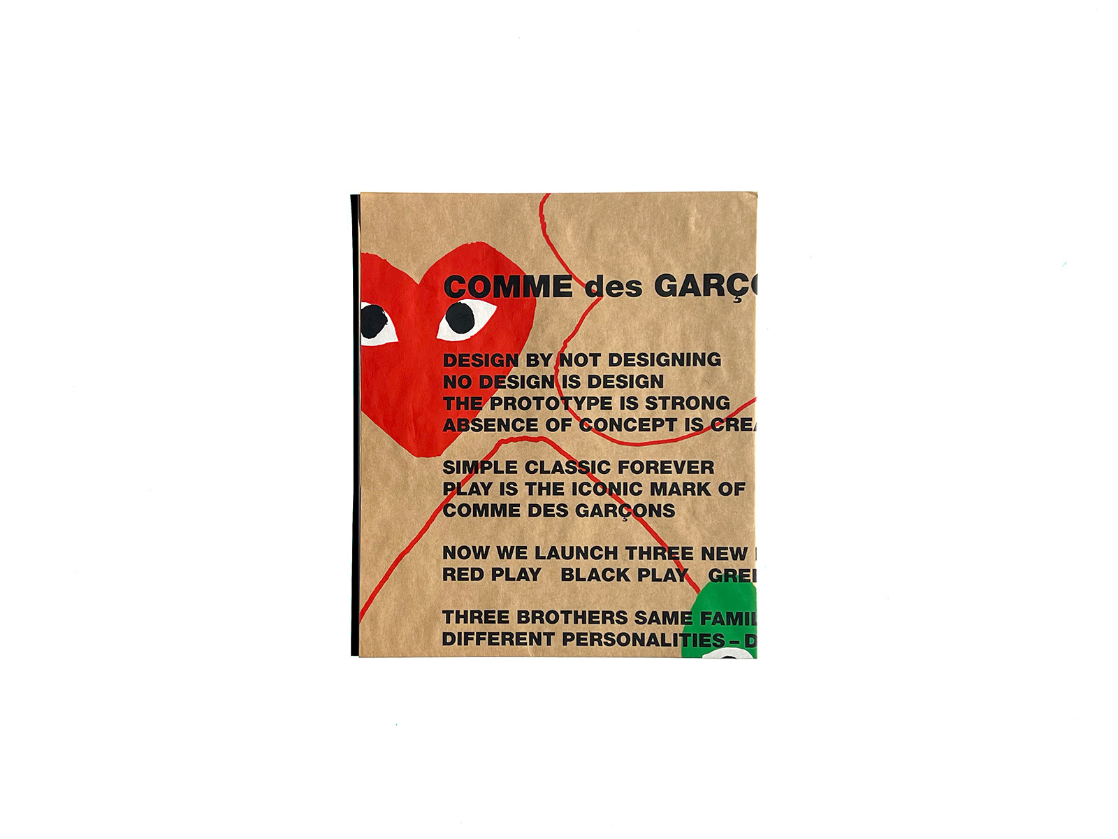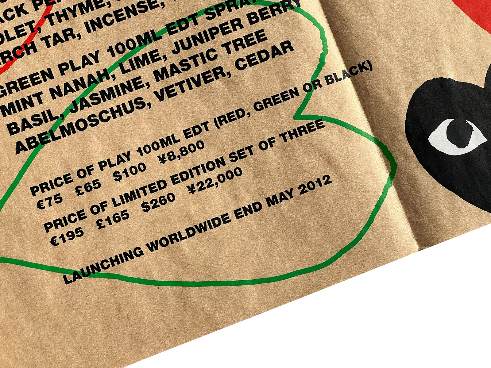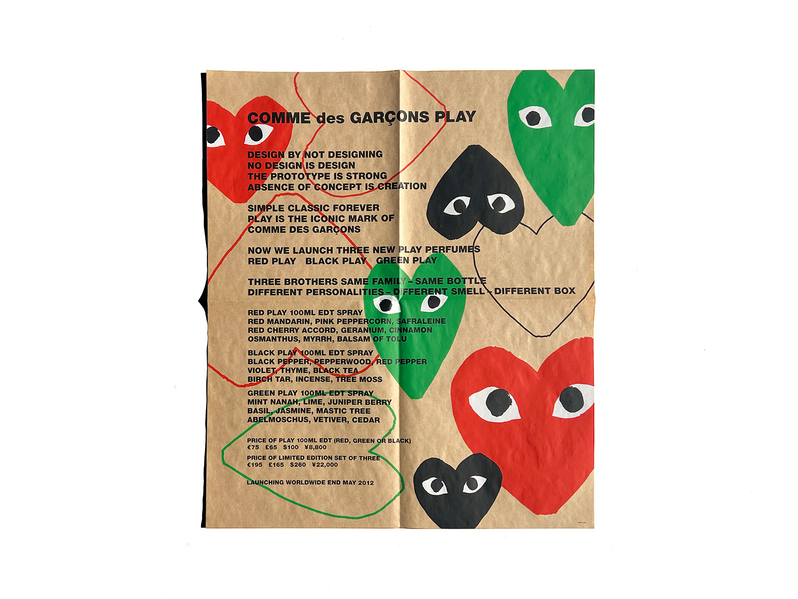 This 4-fold poster was distributed as a direct mail piece to selected customers when Comme des Garçons PLAY launched its 3 perfume lines—RED, BLACK, and GREEN—in 2012.