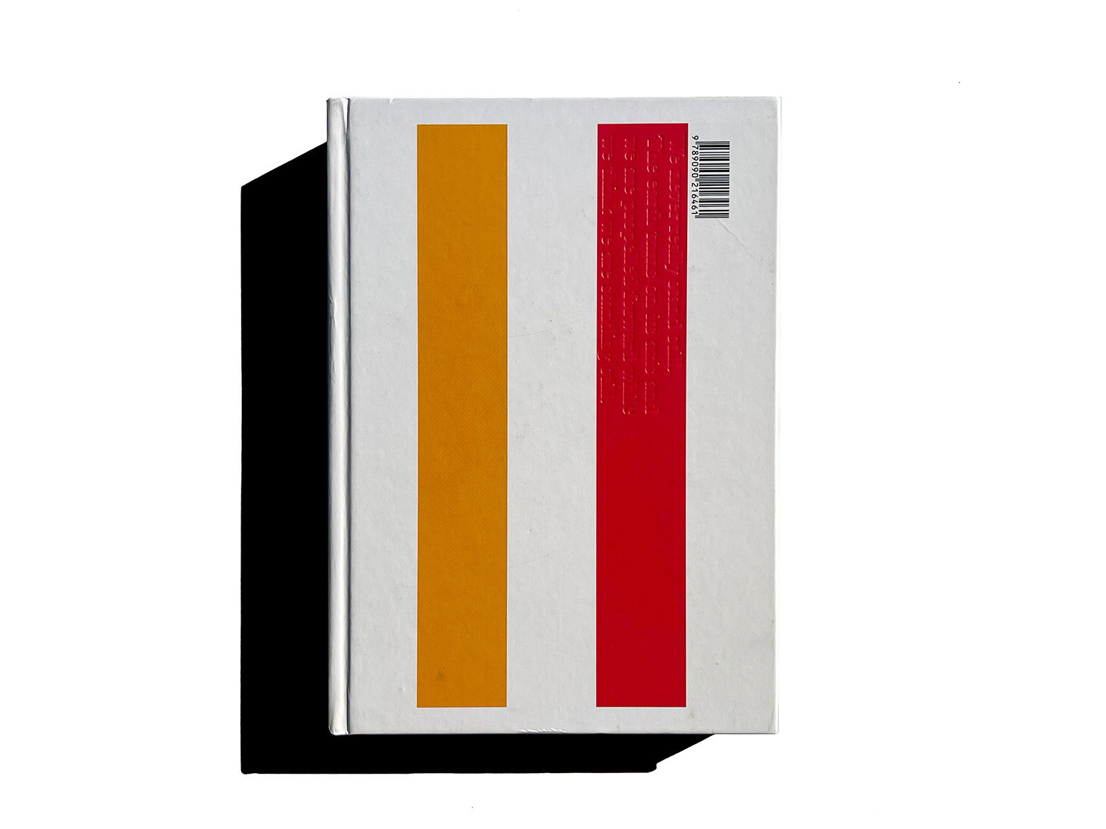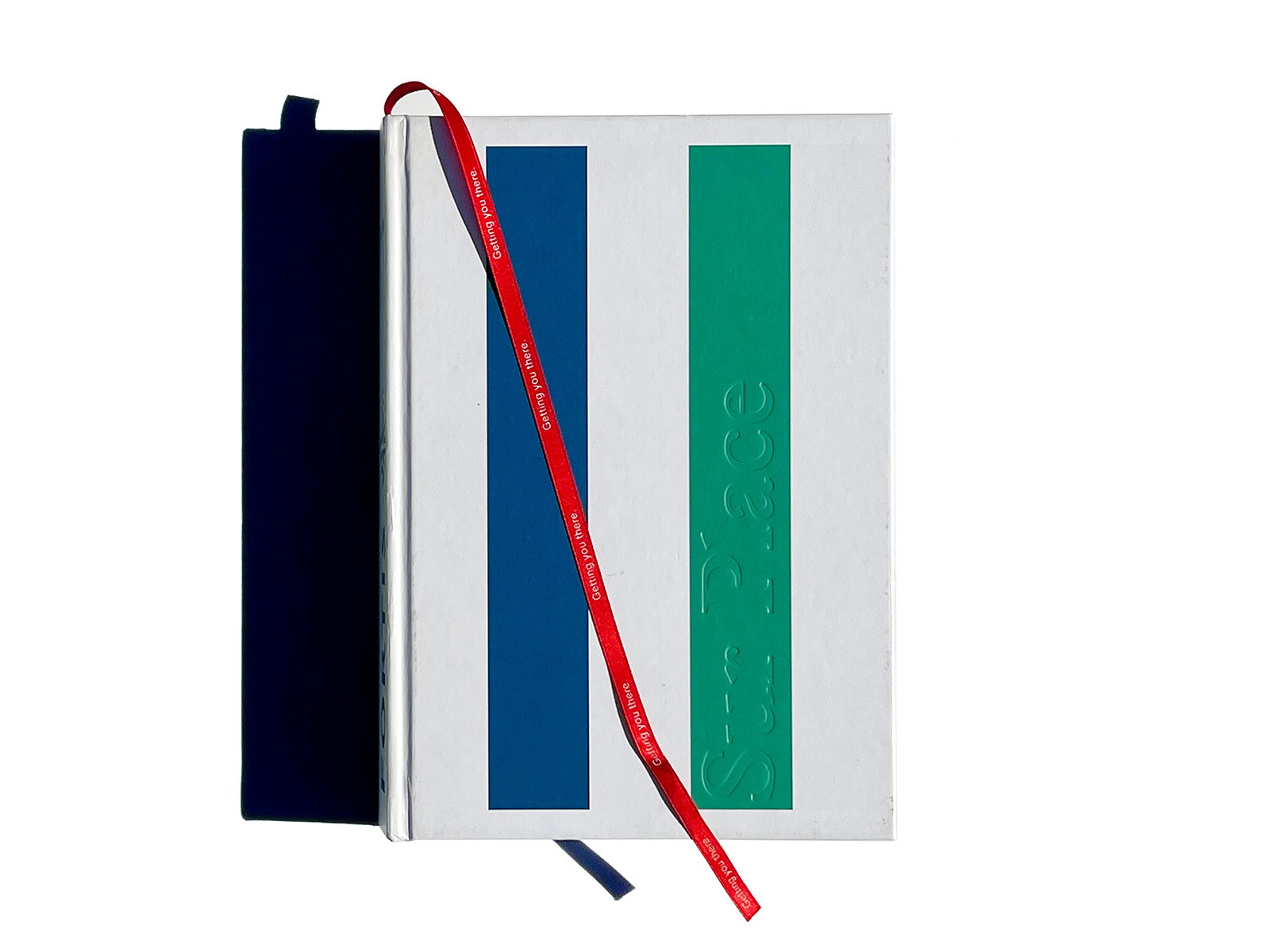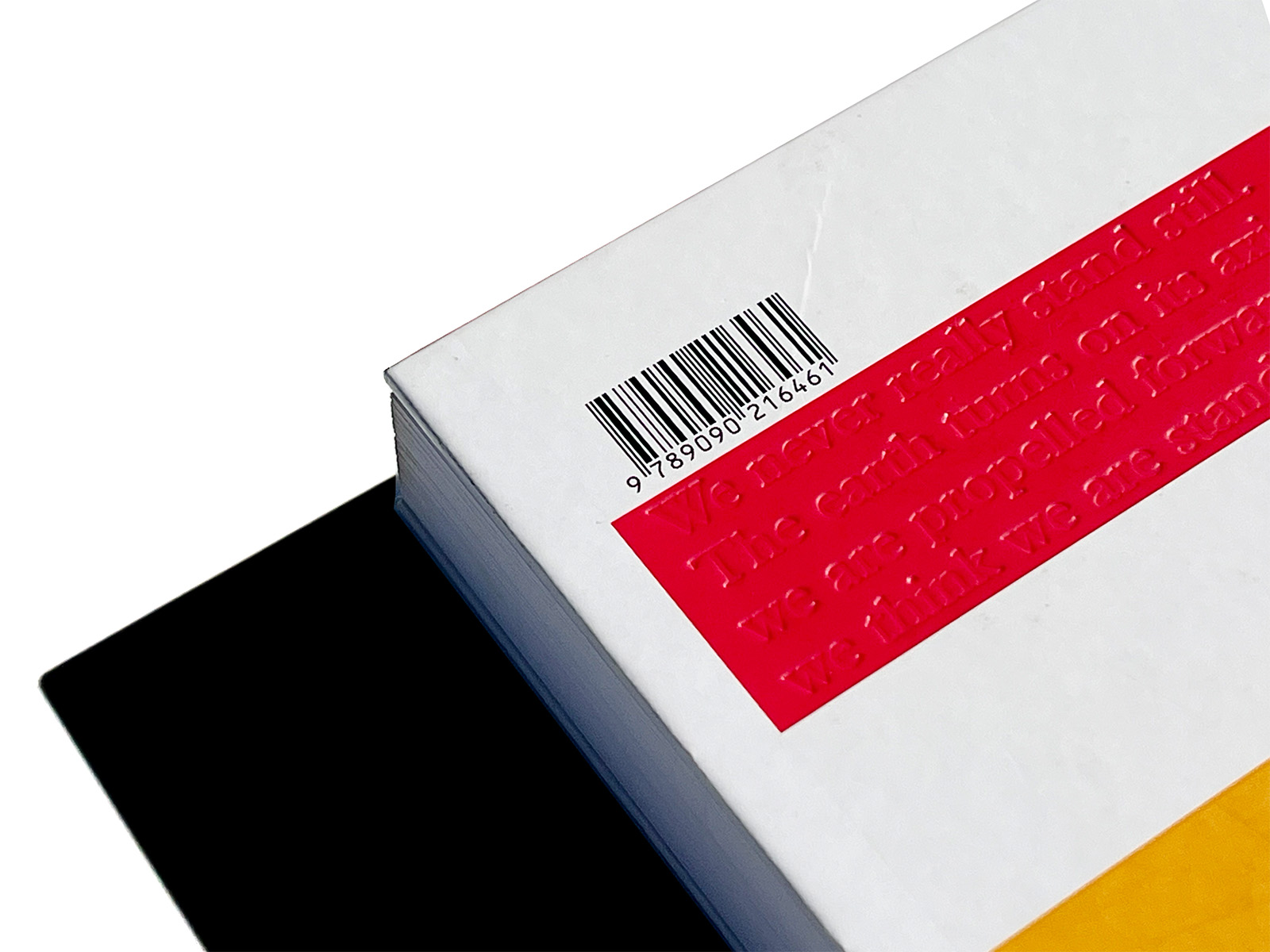 Another striking feature of the cover is the alternation of glossy UV varnish and matt laminate, with the title and back cover text in blind debossing. The book’s boards are only a millimetre larger than the block, another unusual feature and a fine example of what the binders, Boekbinderij Van Waarden, are capable of. That the headband had to be sacrificed is something we can live with. Besides, the ribbon bookmark bearing the text ‘Getting you there’ is ample compensation.