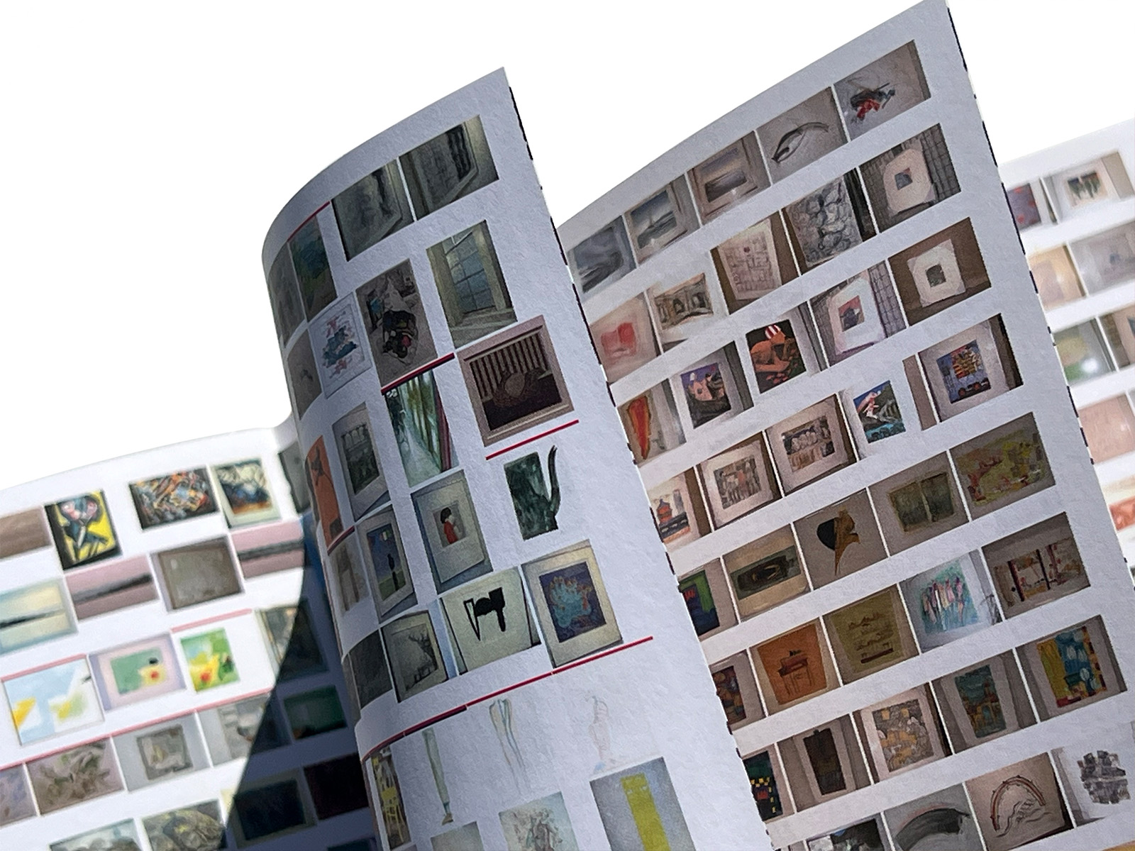 On the outside of the book the first thing to strike one is the screenprinted flower motif on the fore-edge. This is the kind of thing we have seen before from designer Irma Boom. Here she creates a nice contrast with the businesslike vertical bars on the front and back covers, representing the Fortis corporate colours. The effect is that the cover harmonizes amazingly well with the bank’s kaleidoscopic collection of artworks, many thousands of paintings and objects that have more or less accidentally come into its possession through mergers, takeovers and purchases.
