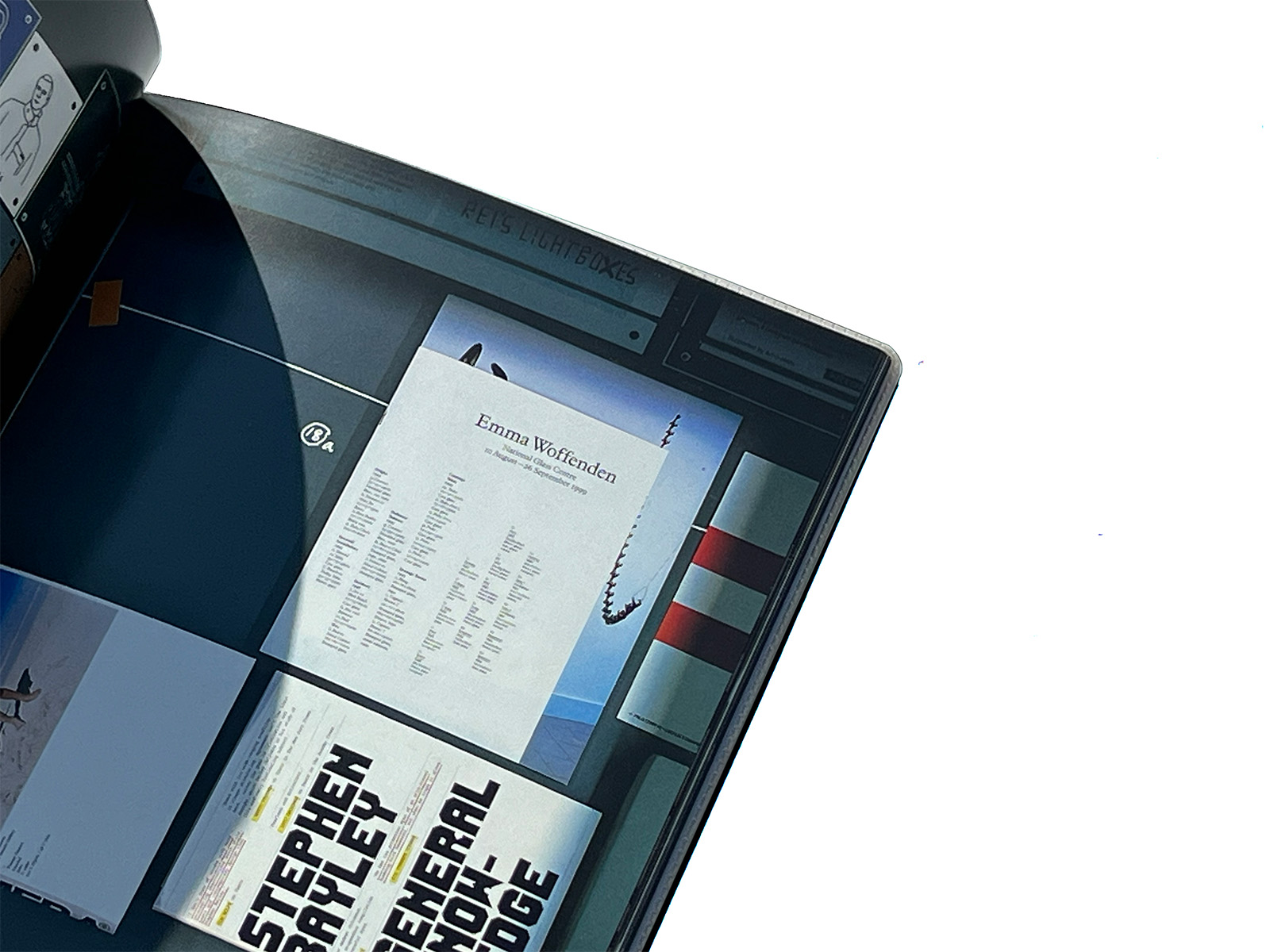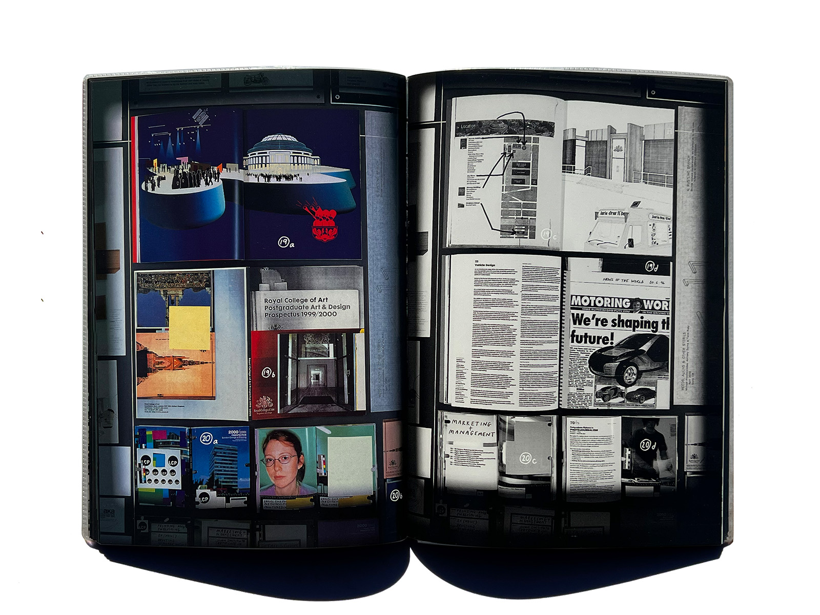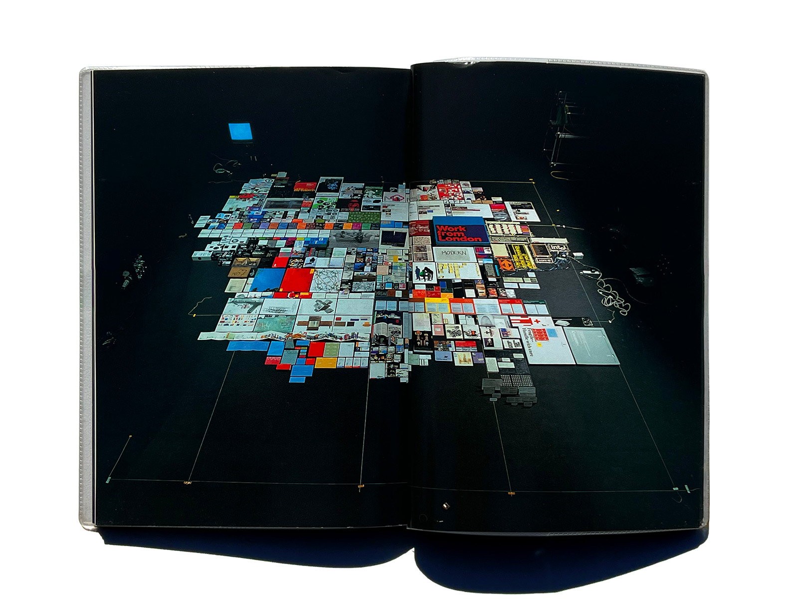 Copies of every past print project were laid out on the floor of a hired film studio and a purpose-built copy camera was rolled across the work. This allowed layout decisions to be made through the camera lens. Once the shots had been taken, the design process was essentially reduced to arranging the images in the right sequence – a relatively easy task.