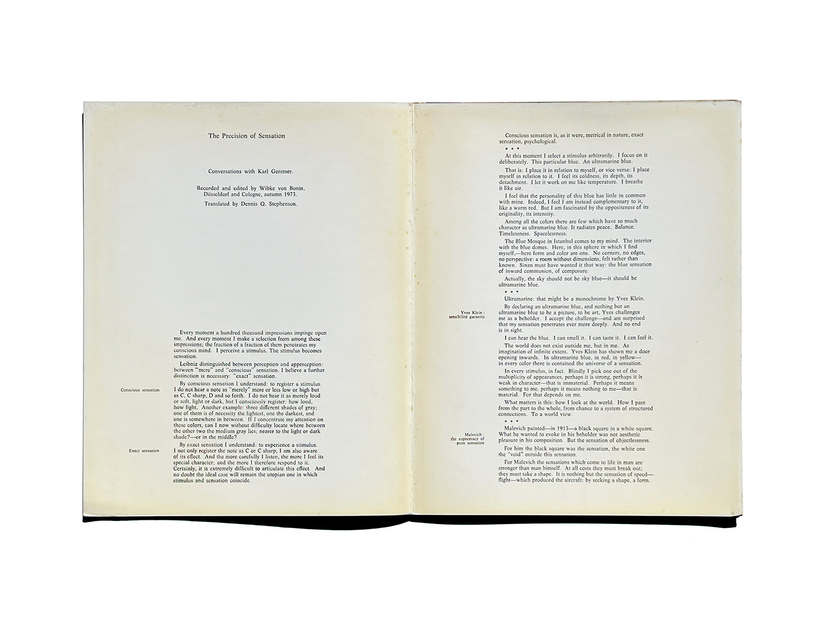 In contrast, the Galerie Denise René (New York) catalogue, written in English, places Gerstner’s work within a broader art-historical and theoretical context. It explicitly refers to figures such as Kazimir Malevich and Piet Mondrian, situating Gerstner’s practice within the lineages of abstract art and Constructivism, and positioning his design thinking in dialogue with these modernist traditions.