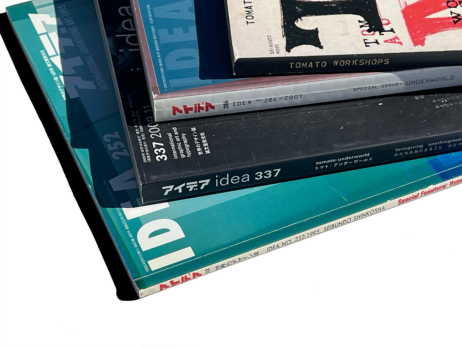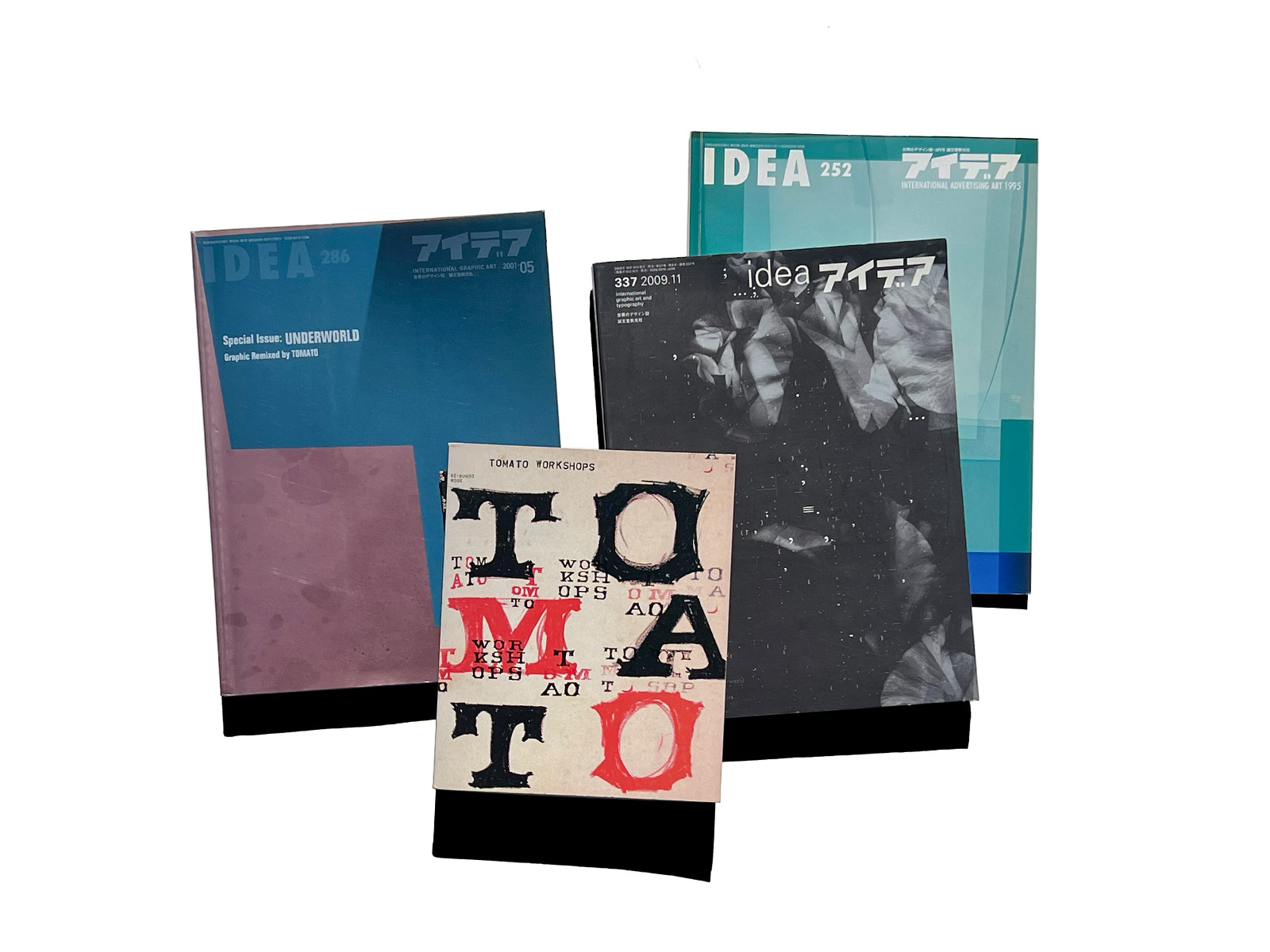 It includes three idea magazine issues featuring tomato — No. 252 (1995), No. 286, and No. 337 (2009) — together with the book Tomato Workshops, edited by the idea editorial team.