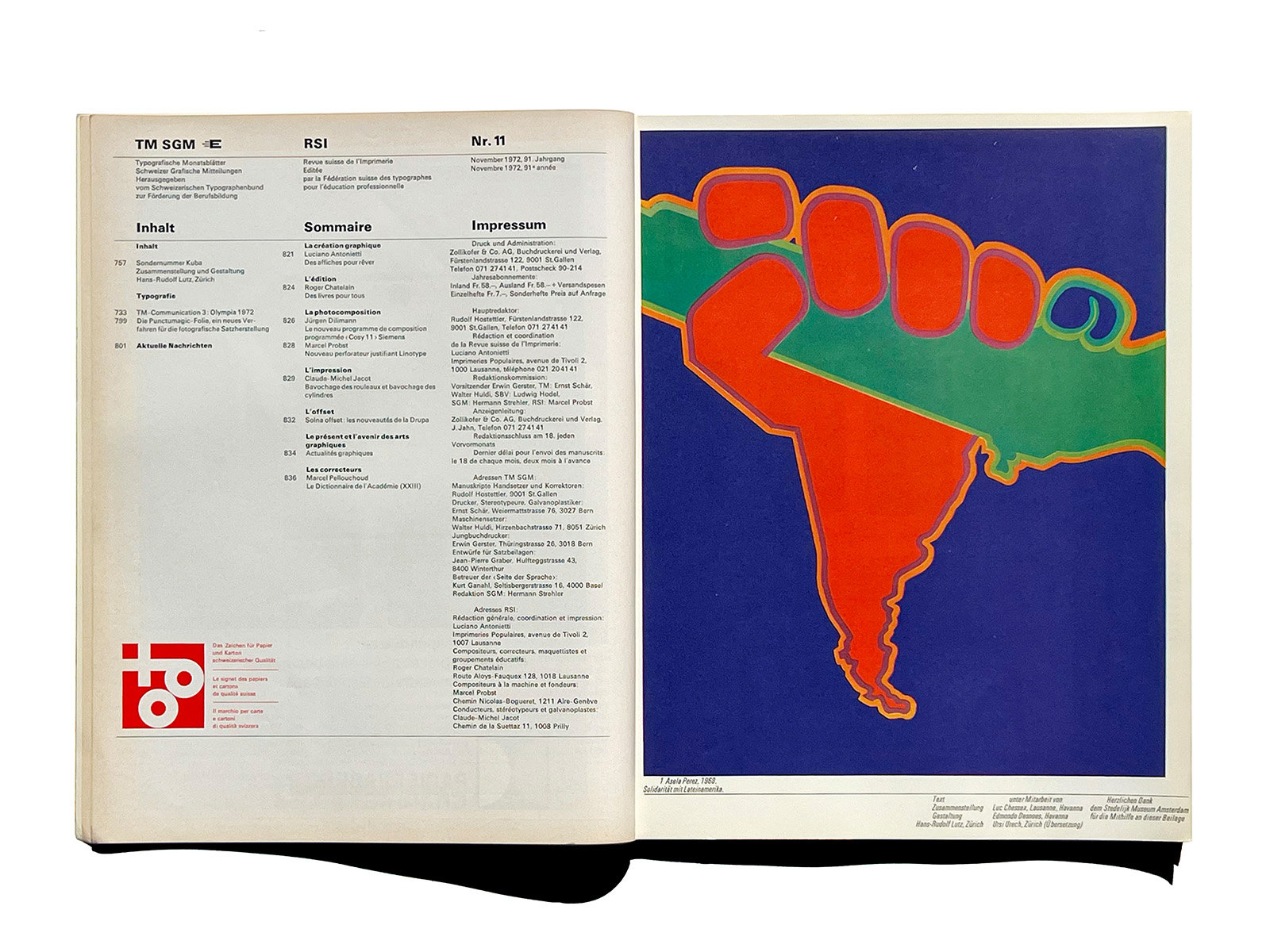 In 1948, TM merged with the French-Swiss magazine ‘‘Revue suisse de l’Imprimerie’’ (Swiss Printing Journal), RSI. Founded in 1923 by Emile Guggi, Lausanne, under the name ’‘Revue suisse de l’Imprimerie et des Industries annexes’’ (Swiss Journal of Printing and Related Industries).