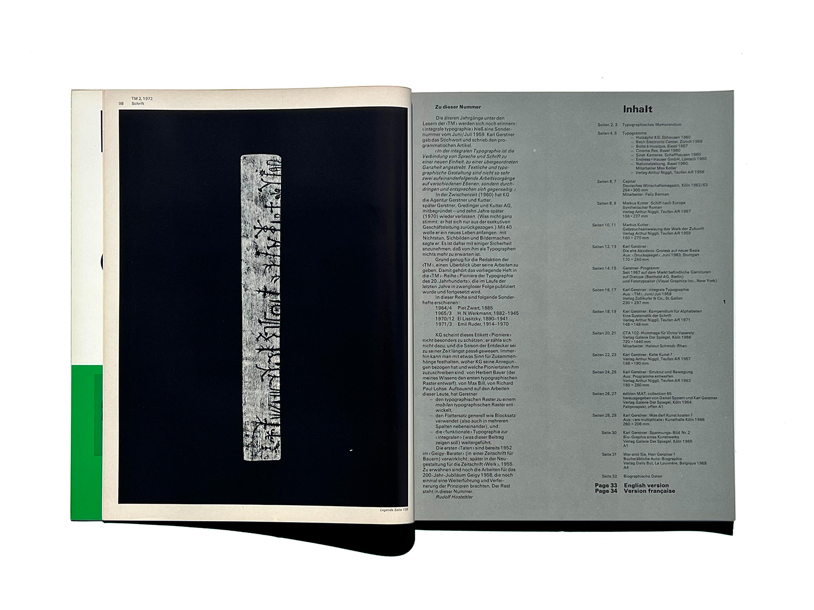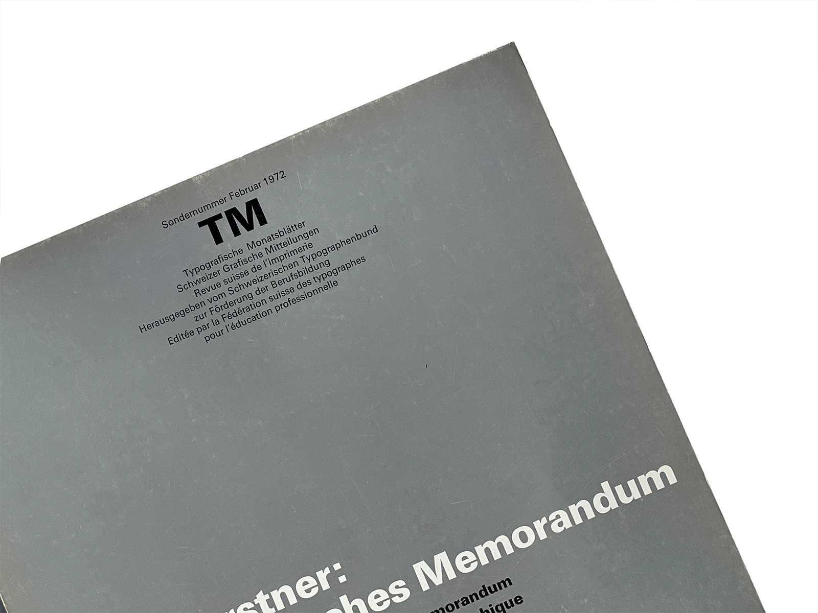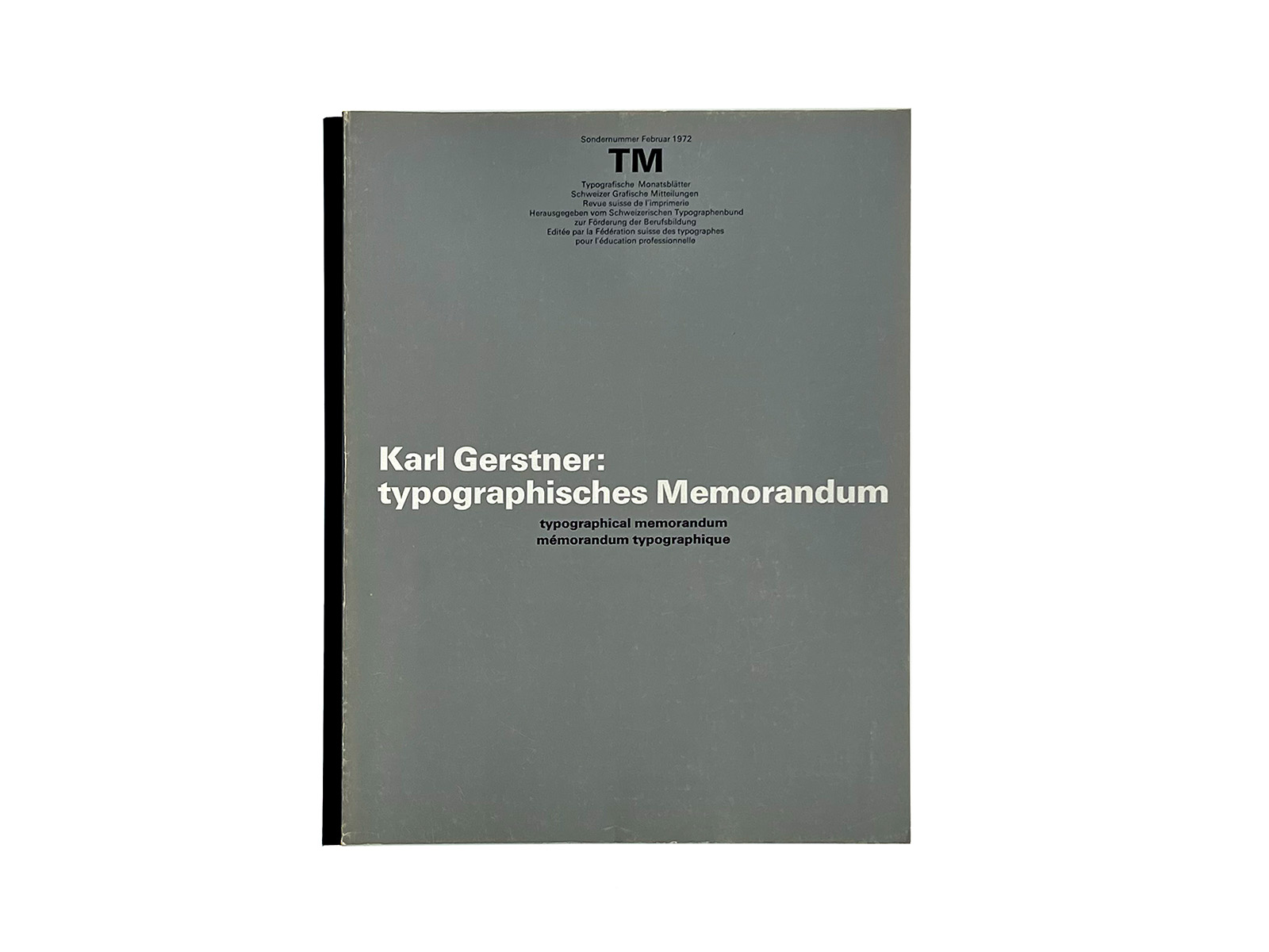 Typographische Monatsblätter (Typographic Monthly Sheets), TM, was founded in 1933 by the ‘‘Schweizerischer Typographenbund, Bern’’ (Swiss Typographic Society, Bern).