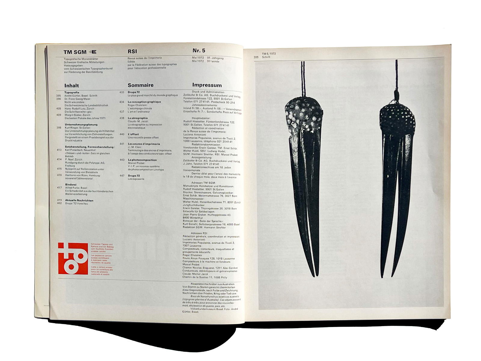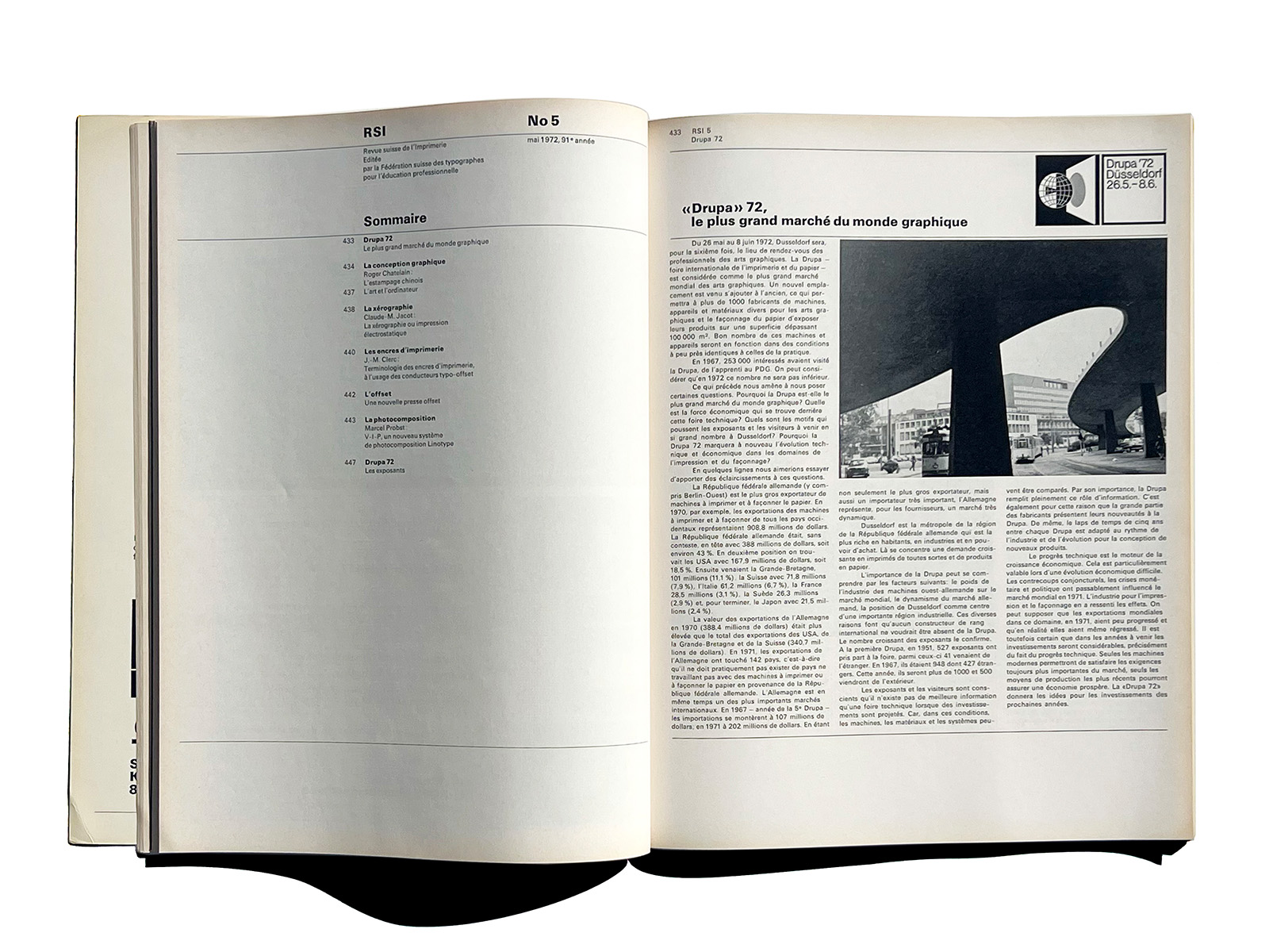 In 1948, TM merged with the French-Swiss magazine ‘‘Revue suisse de l’Imprimerie’’ (Swiss Printing Journal), RSI. Founded in 1923 by Emile Guggi, Lausanne, under the name ’‘Revue suisse de l’Imprimerie et des Industries annexes’’ (Swiss Journal of Printing and Related Industries).
