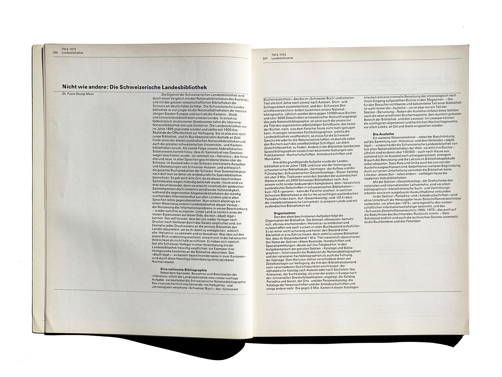 Typographische Monatsblätter (Typographic Monthly Sheets), TM, was founded in 1933 by the ‘‘Schweizerischer Typographenbund, Bern’’ (Swiss Typographic Society, Bern).