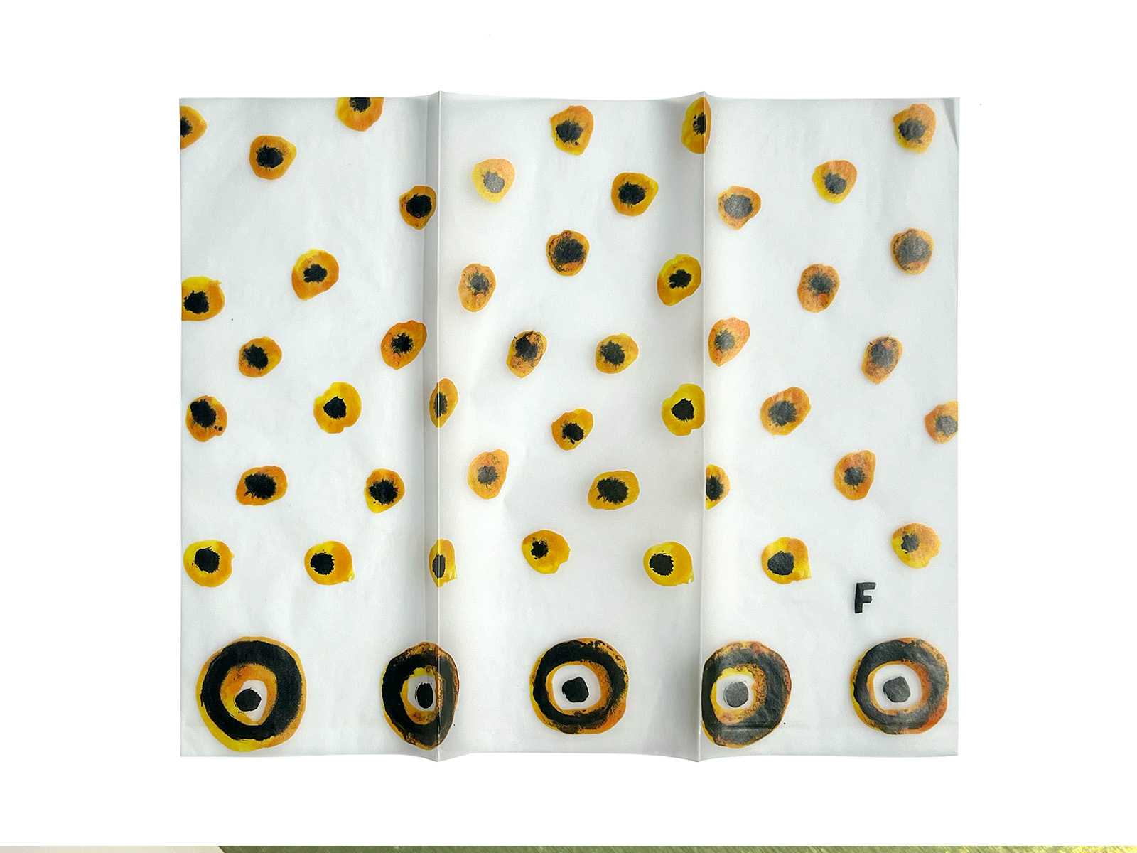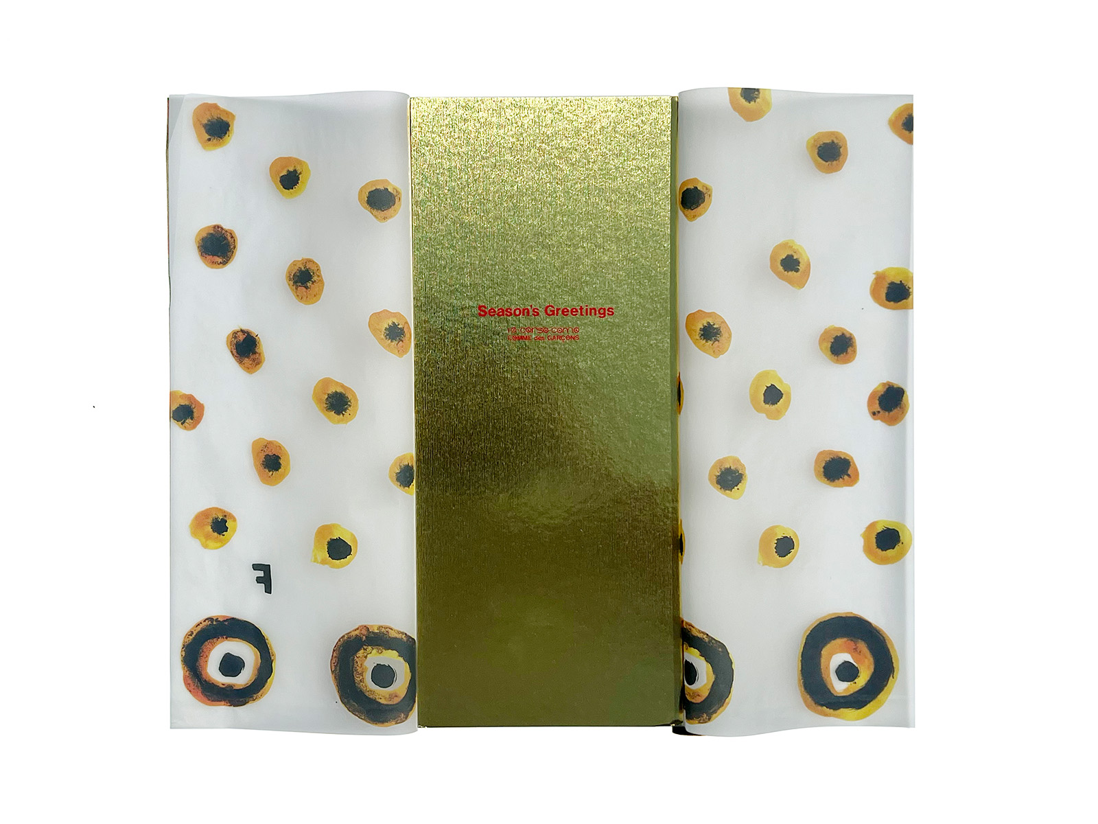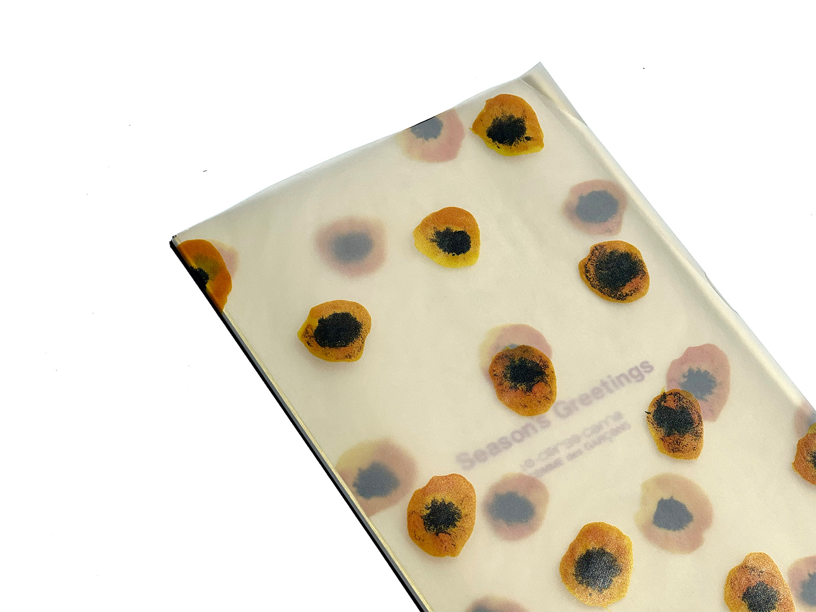 Filip Pagowski’s dots artworks are printed on tracing paper and wrapped around a vertical gold card.