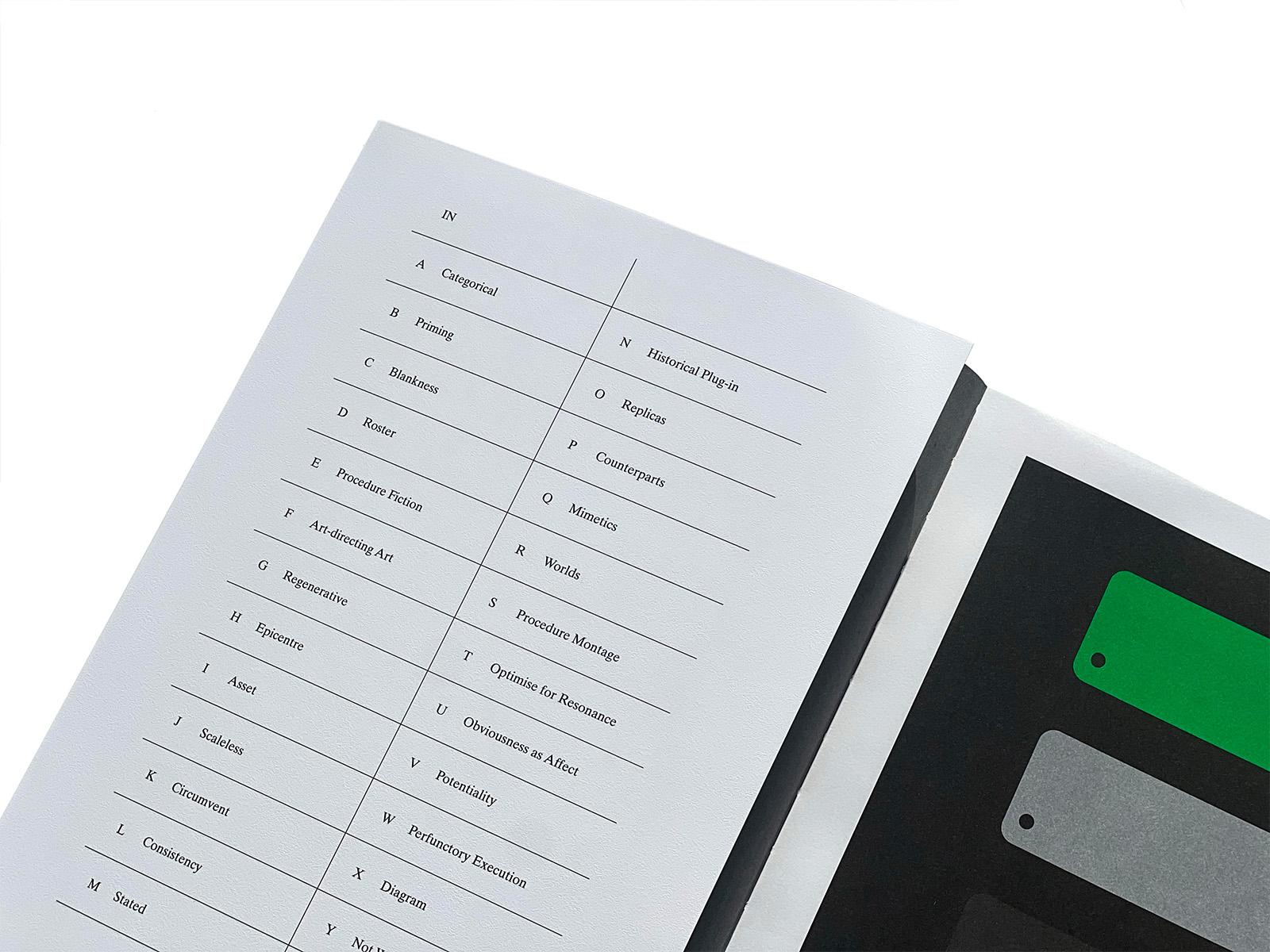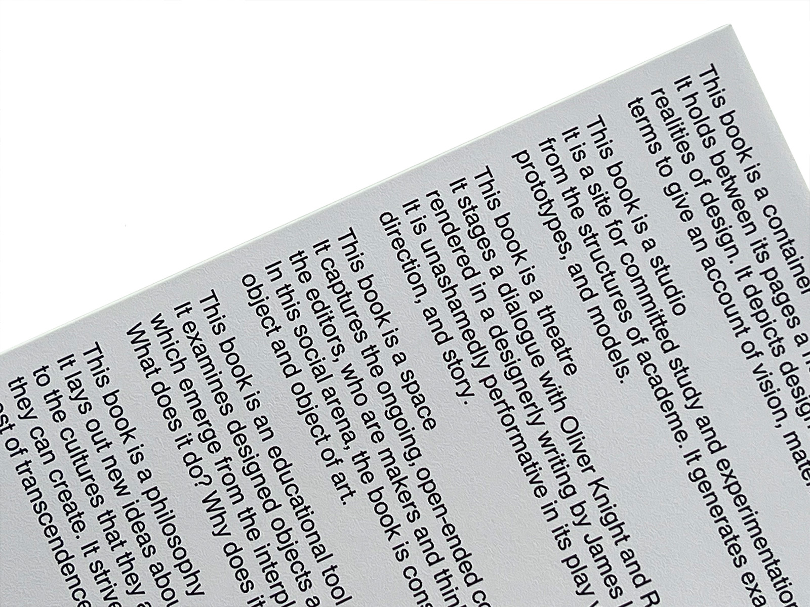 This book is the result of discourse, between Oliver Knight, Rory McGrath (OK-RM) and James Langdon, in London and Berlin. It was made and remade as an idea of itself: versions of it were spoken aloud, thought through, dismissed. It began to manifest in text before it had any material specifications. Its happening as an exhibition, in Hangzhou, concentrated it and gave it structure. Negotiation of its production as an industrial design object, with DZA in Altenburg, gave its pages gravity and specificity. In its final phase it became a collective pursuit of synchronicity, its sequences of technical parameters brought into rhythm with its content.