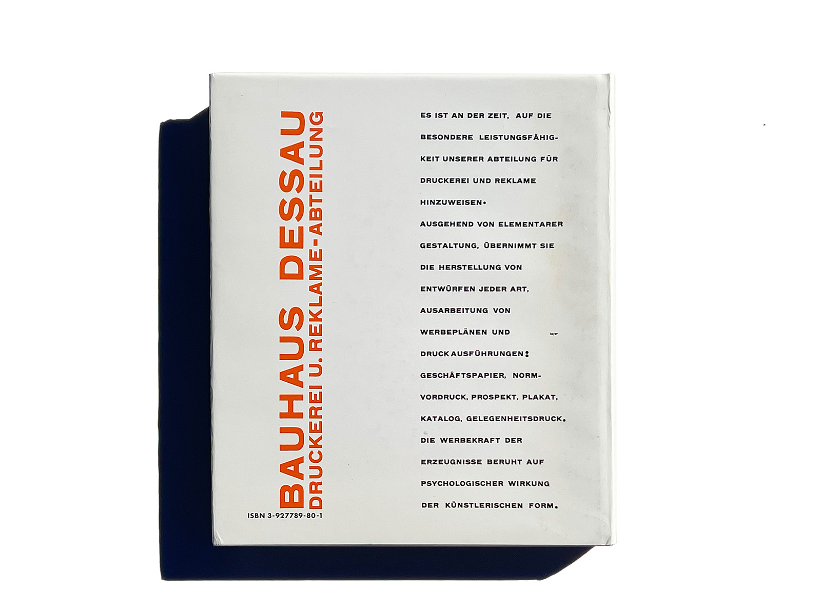 Bauhaus; Weimar 1919–25, Dessau 1925–32 and Berlin 1932–33. Profusely illustrated with more than 450 examples from design luminaries such as: László Moholy-Nagy, Herbert Bayer, Josef Albers, Joost Schmidt, Max Bill, Erich Comeriner, Alfred Arndt, Xanti Schawinsky, Oscar Schlemmer and more. With important texts by: Kurt Schwitters, Iwan Tschichold, Mart Stam and El Lissitzky, Max Burchartz, Johannes Molzahn, Willy Baumeister, Walter Dexel, Theo van Doesburg and more.