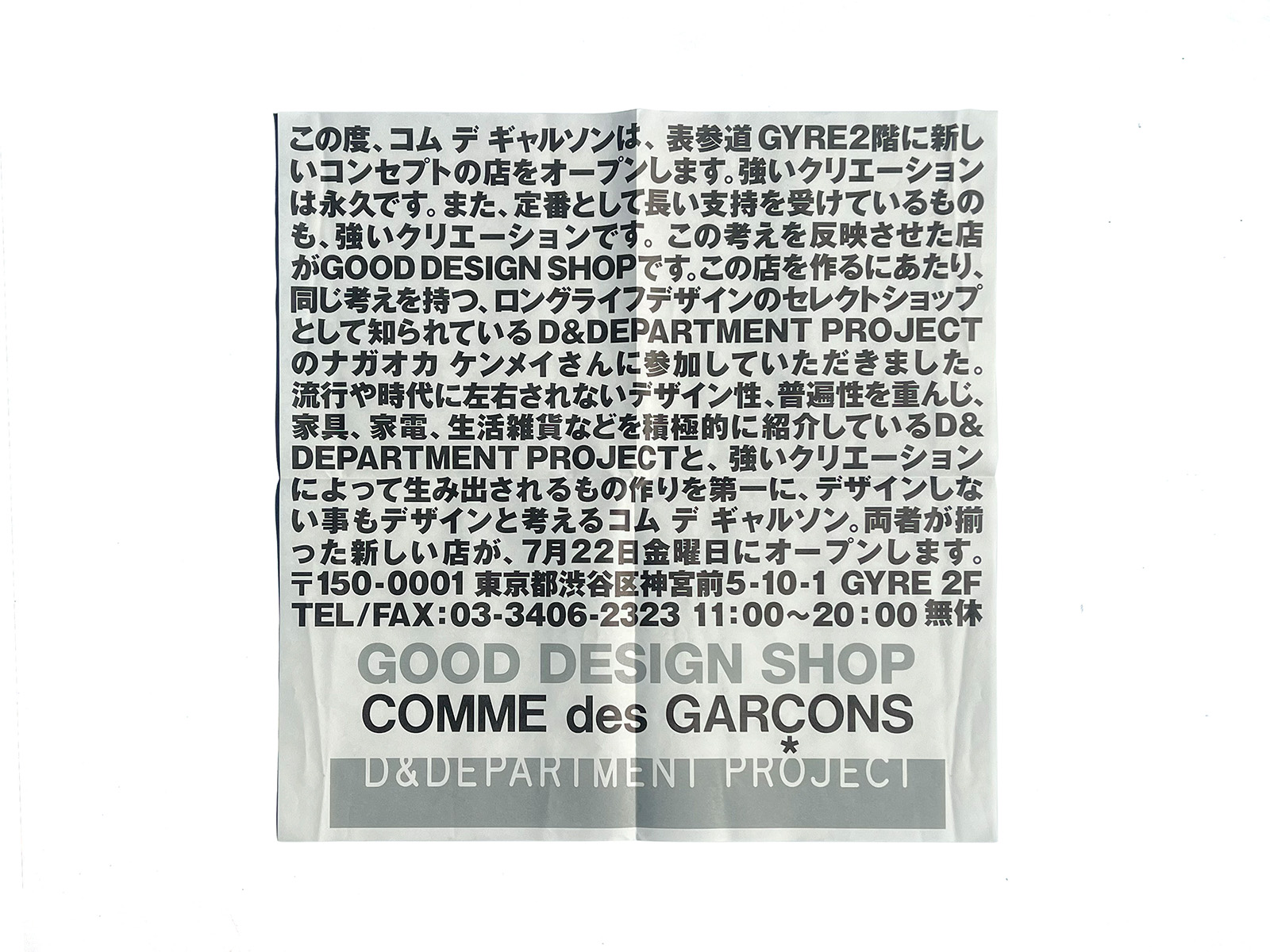 This large poster announces the opening of GOOD DESIGN SHOP, a collaboration between COMME des GARÇONS and D&DEPARTMENT PROJECT. It comes as a set of 2 posters: one in Japanese and one in English.