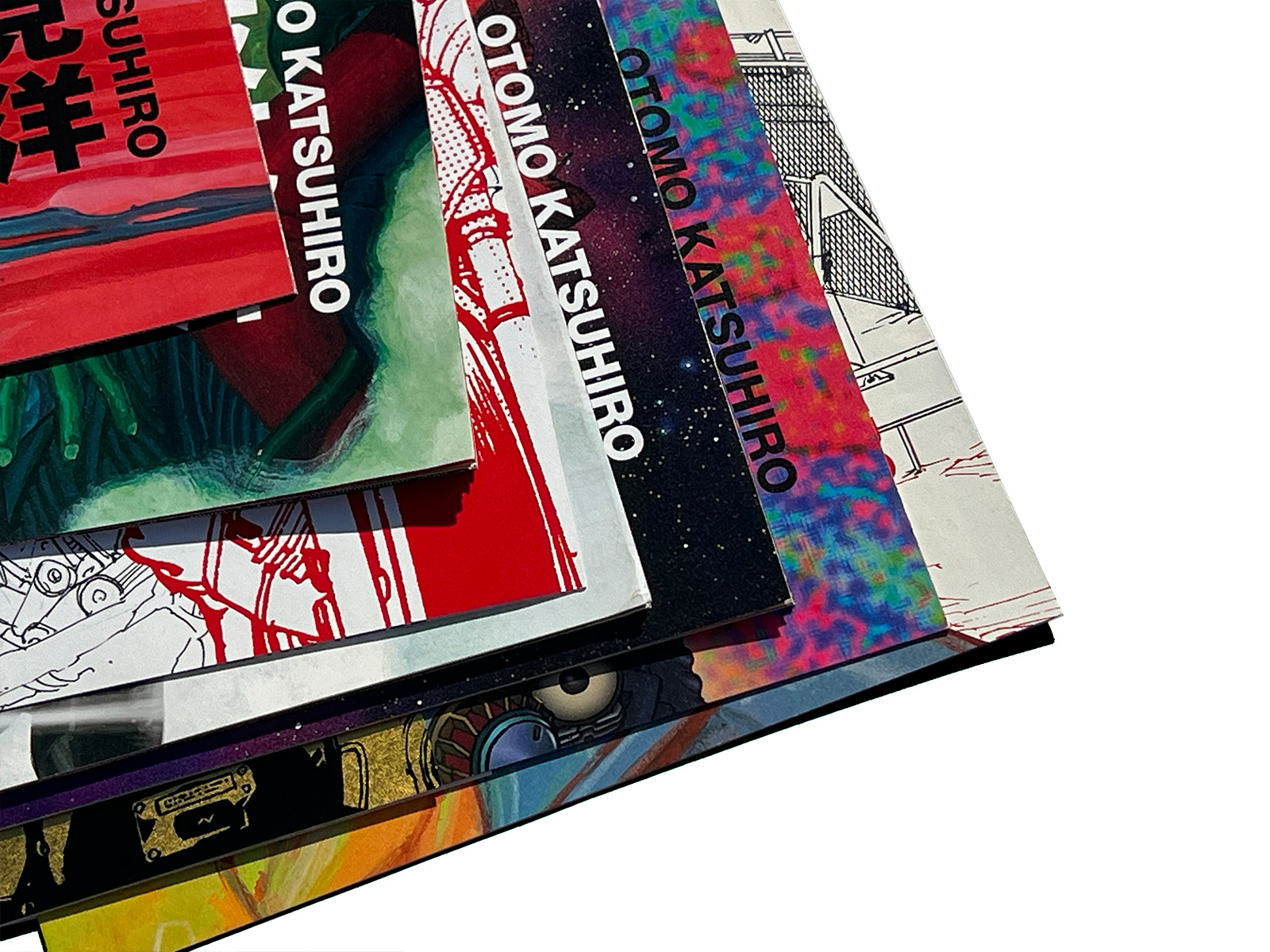 The covers feature iconic characters such as Kaneda and Tetsuo from AKIRA, while Otomo’s name, boldly rendered in kanji, asserts a powerful visual presence.