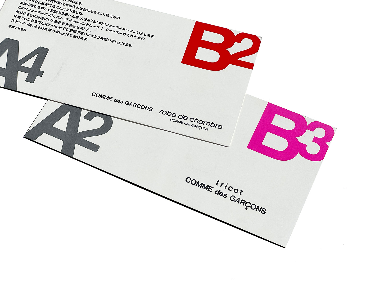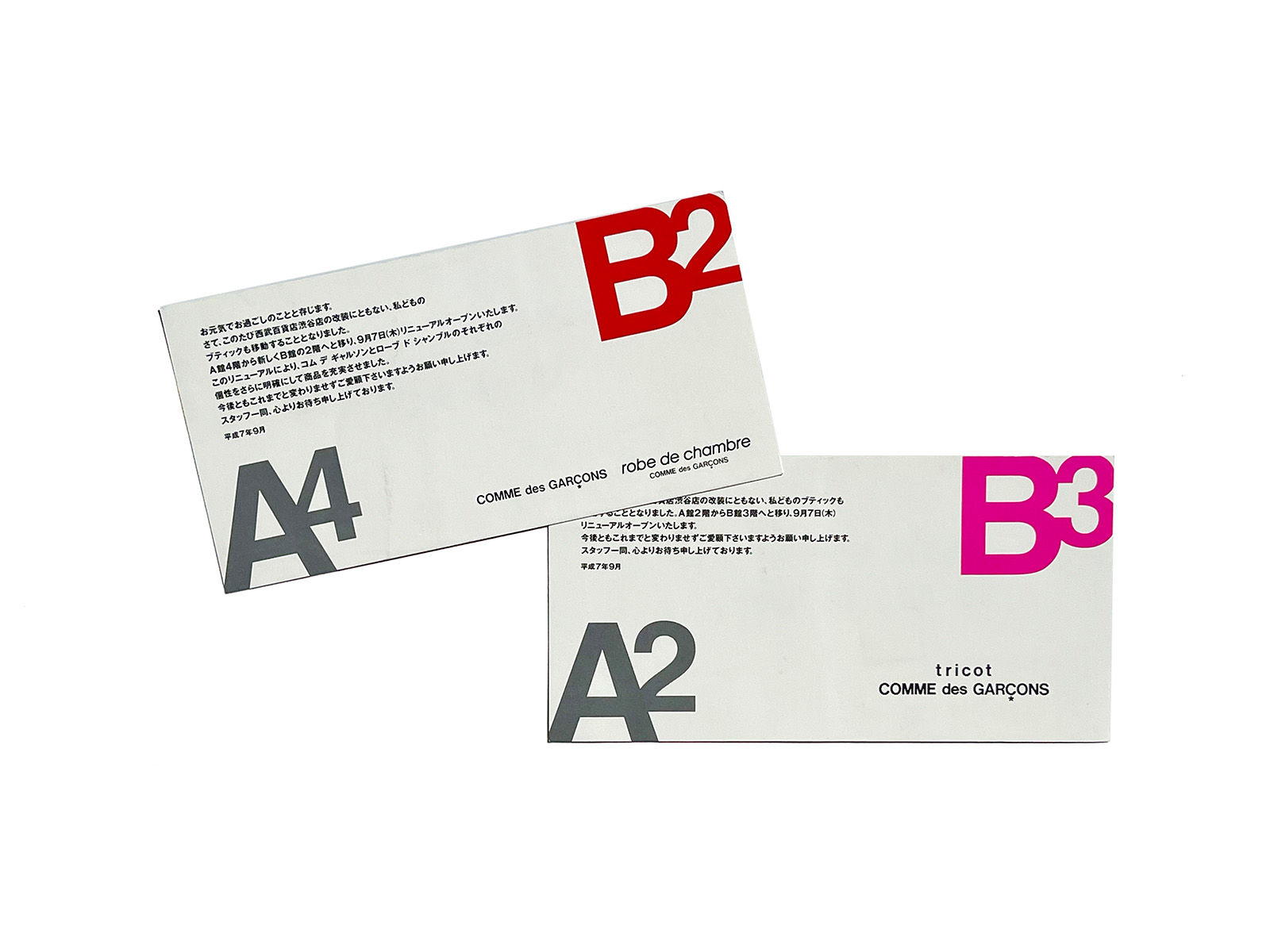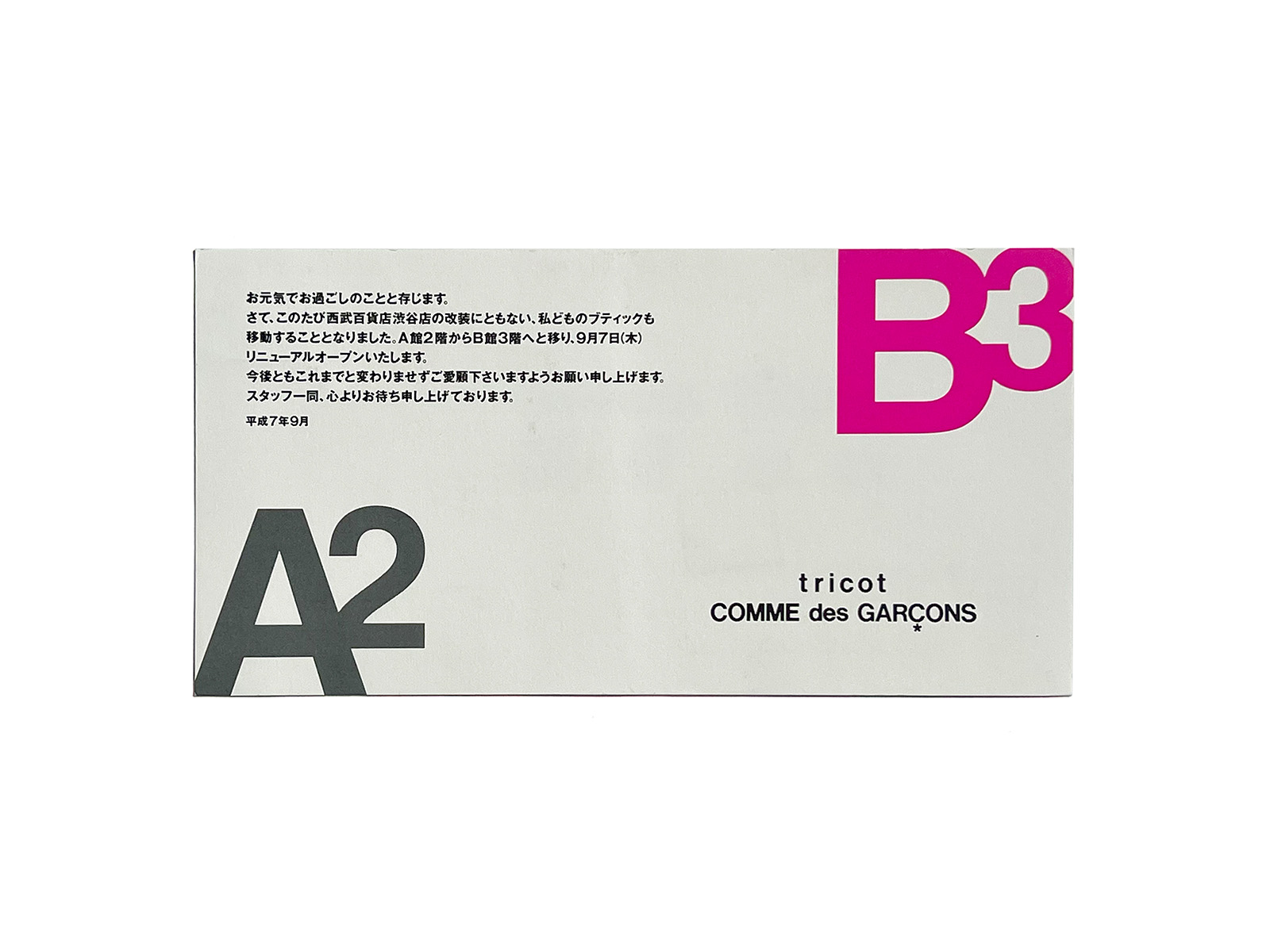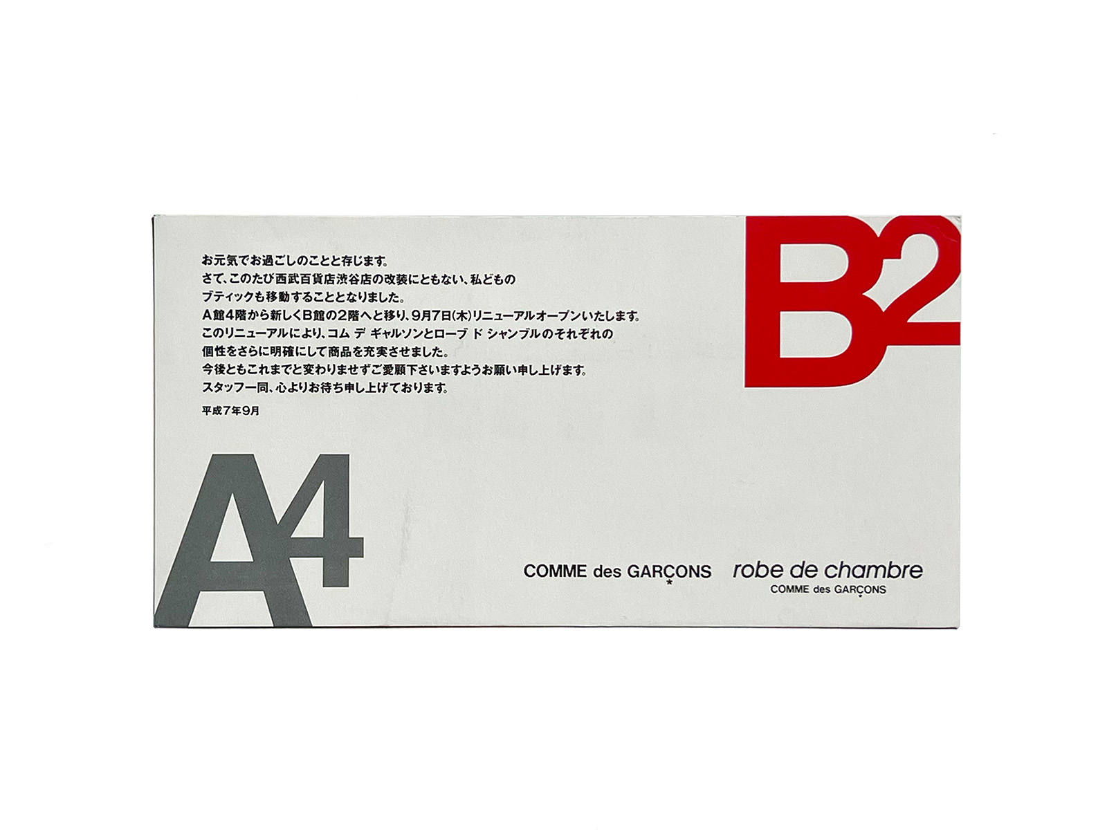 This card was issued as a direct mail for robe de chambre COMME des GARÇONS and tricot COMME des GARÇONS, on the occasion of their relocation within Seibu Department Store Shibuya, which consists of two buildings, A and B, and was undergoing renovation.