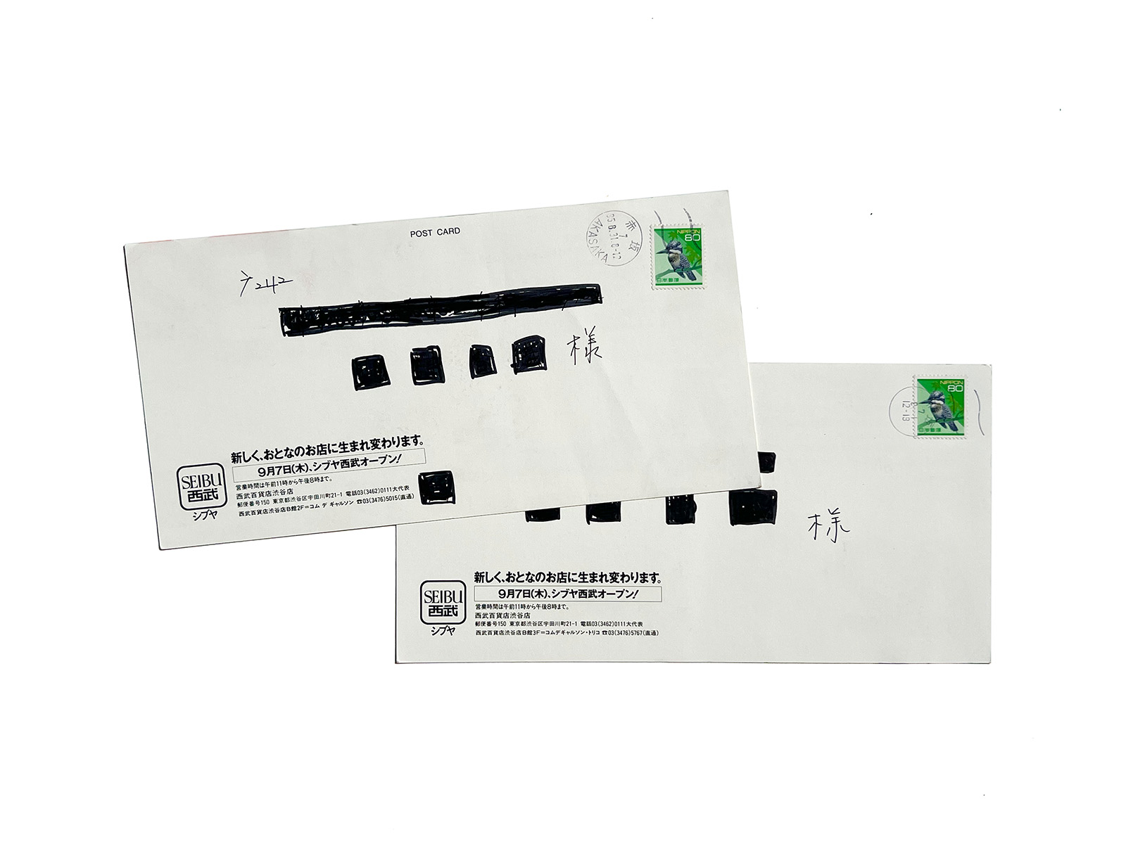 Each card is stamped, pre-used, and has an address label on the back that has been crossed out with black marker,