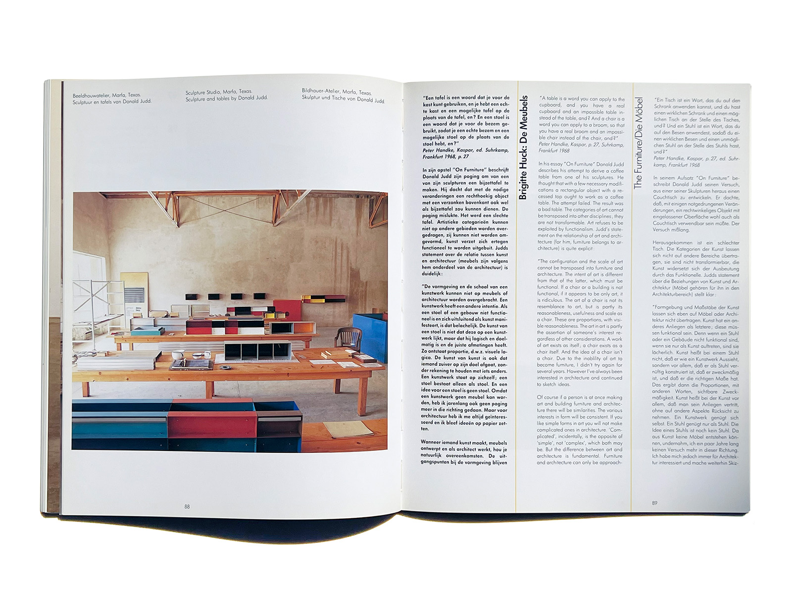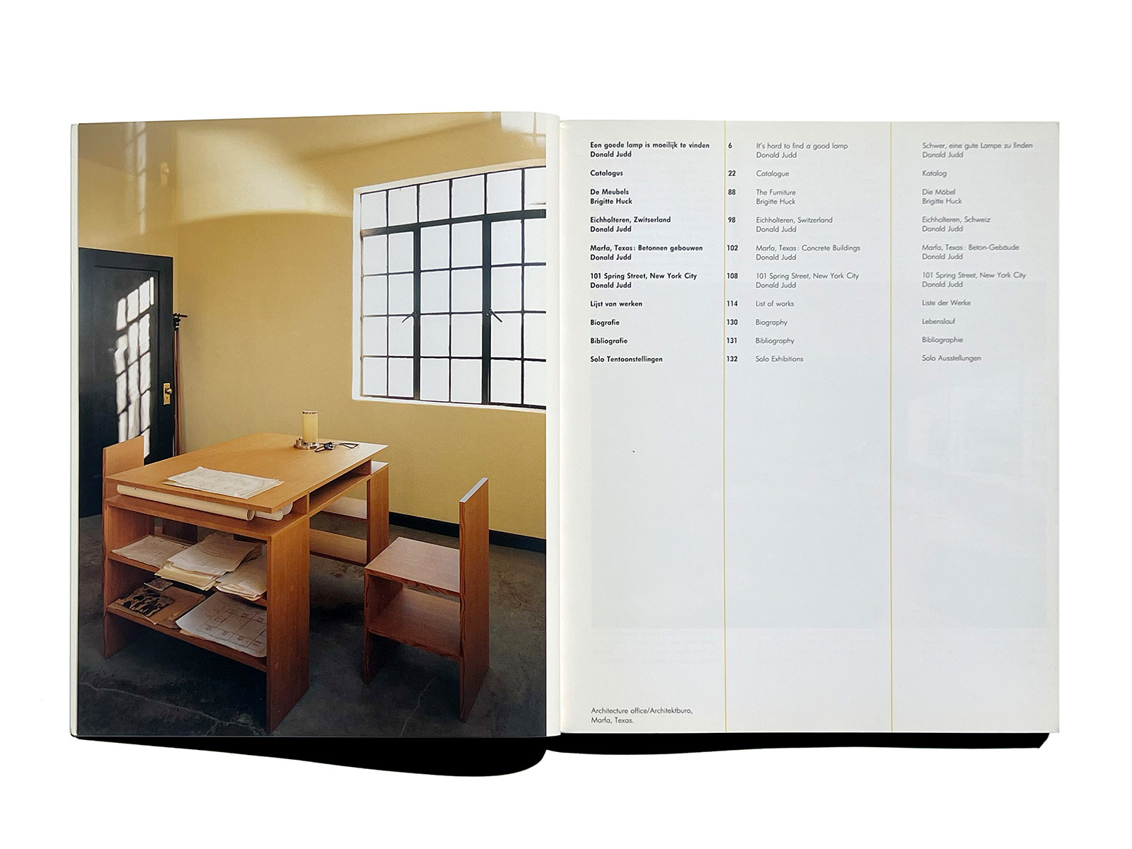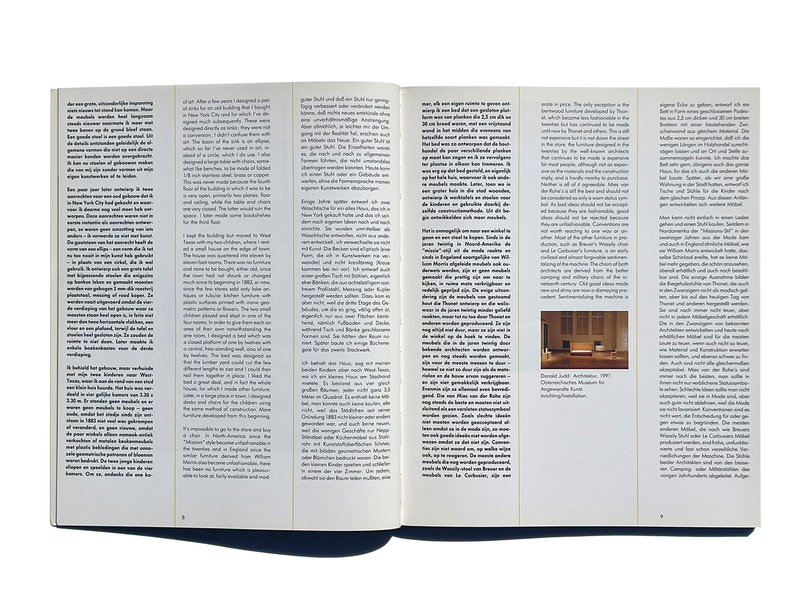 8voは当時Museum Boijmans Van Beuningen(ロッテルダム)の館長であったウィム・クロウエルの推薦を受け、1980〜1990年代に同館の出版物を数多く手がけています。その流れの中で1993年あるいは1994年に刊行されたもので、ドナルド・ジャッドの家具作品の概要を解説するとともに、エッセイ「良いランプを見つけるのは難しい」を収録しています。このエッセイでは、テキサス州マーファの自宅にふさわしい家具を探すのに苦労したジャッドが、初めて椅子やテーブルの製作に挑戦した経緯が一部綴られています。また、デザイナー家具、アンティーク家具、大量生産家具の問題点を考察し、良質な家具の価格や入手の困難さを批判するとともに、良いデザインと悪いデザインの本質について論じています。