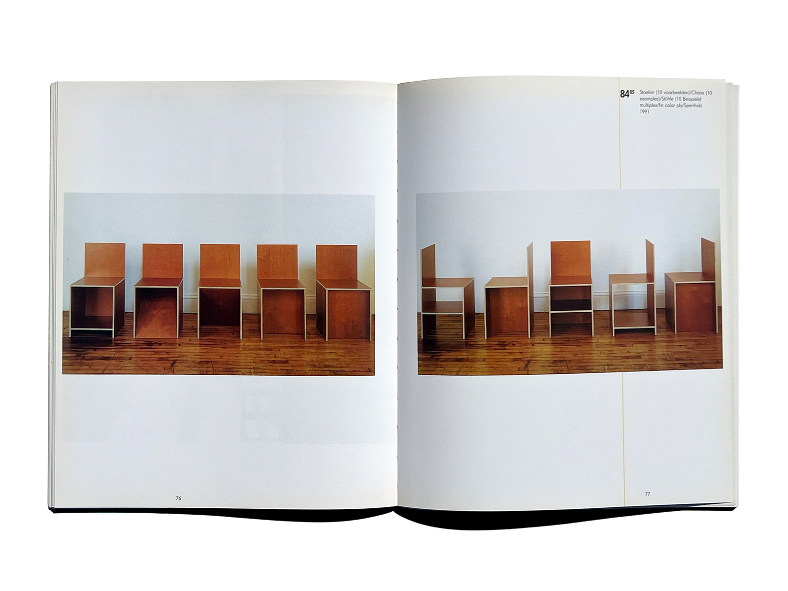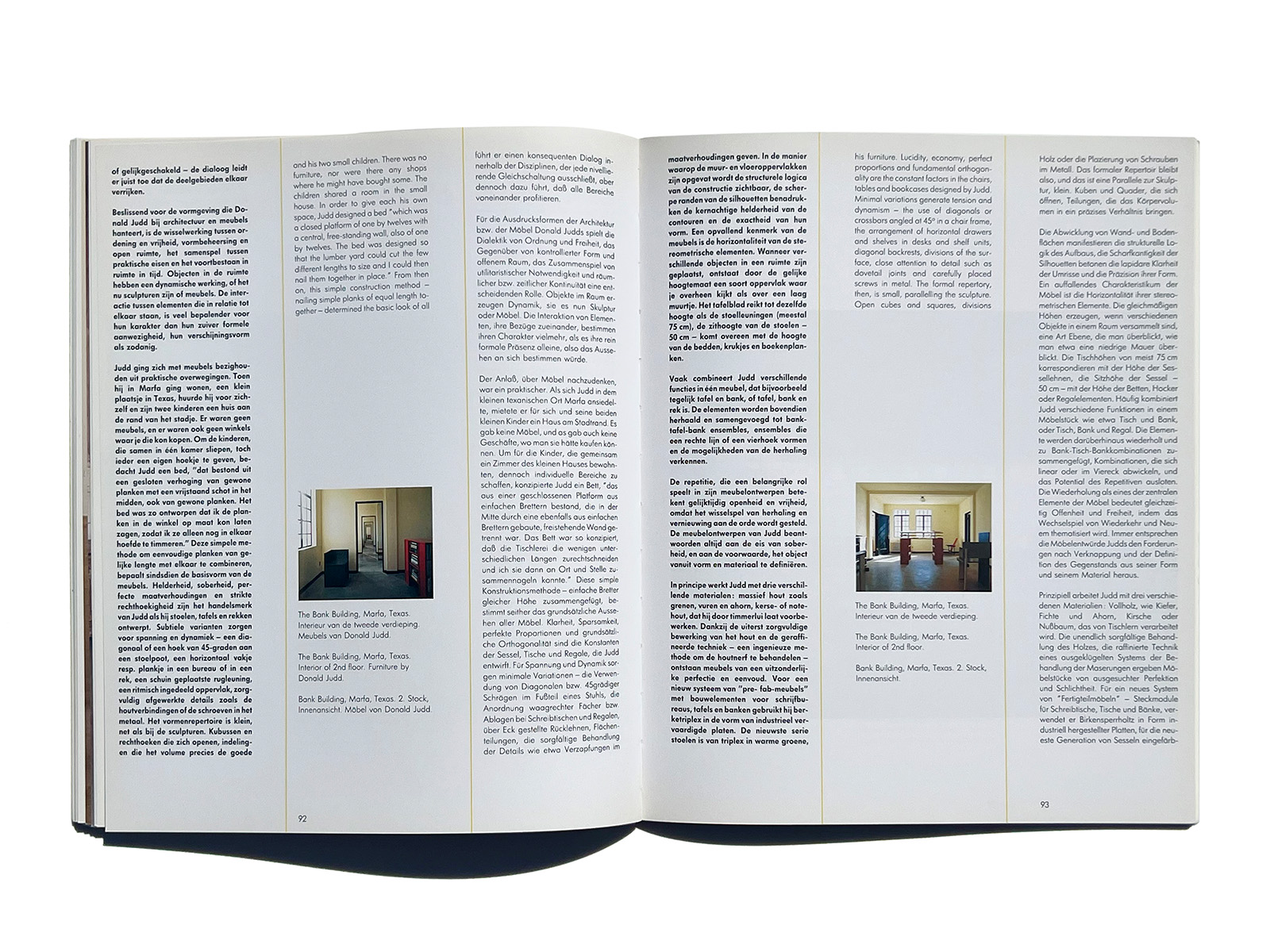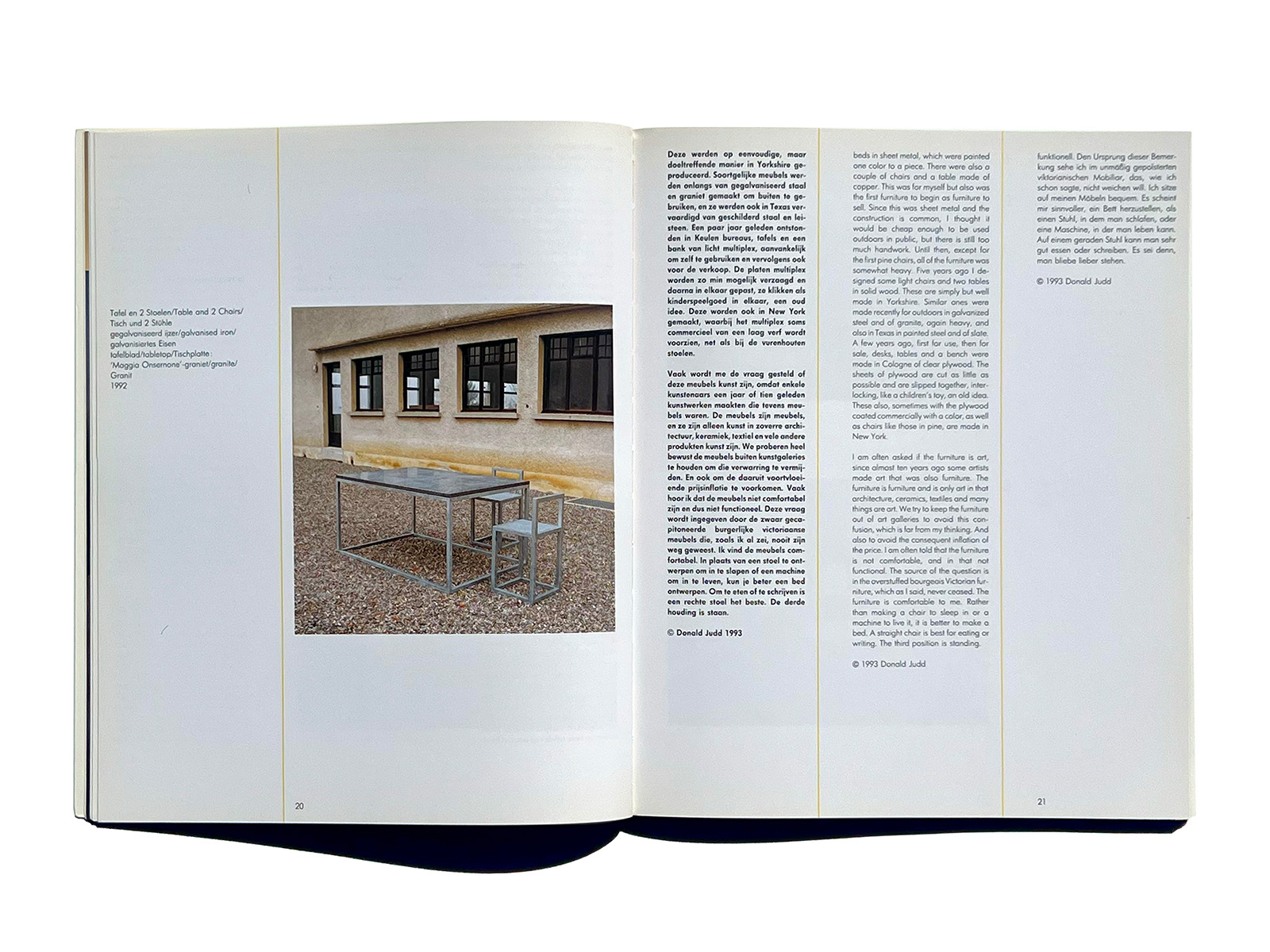 8voは当時Museum Boijmans Van Beuningen(ロッテルダム)の館長であったウィム・クロウエルの推薦を受け、1980〜1990年代に同館の出版物を数多く手がけています。その流れの中で1993年あるいは1994年に刊行されたもので、ドナルド・ジャッドの家具作品の概要を解説するとともに、エッセイ「良いランプを見つけるのは難しい」を収録しています。このエッセイでは、テキサス州マーファの自宅にふさわしい家具を探すのに苦労したジャッドが、初めて椅子やテーブルの製作に挑戦した経緯が一部綴られています。また、デザイナー家具、アンティーク家具、大量生産家具の問題点を考察し、良質な家具の価格や入手の困難さを批判するとともに、良いデザインと悪いデザインの本質について論じています。