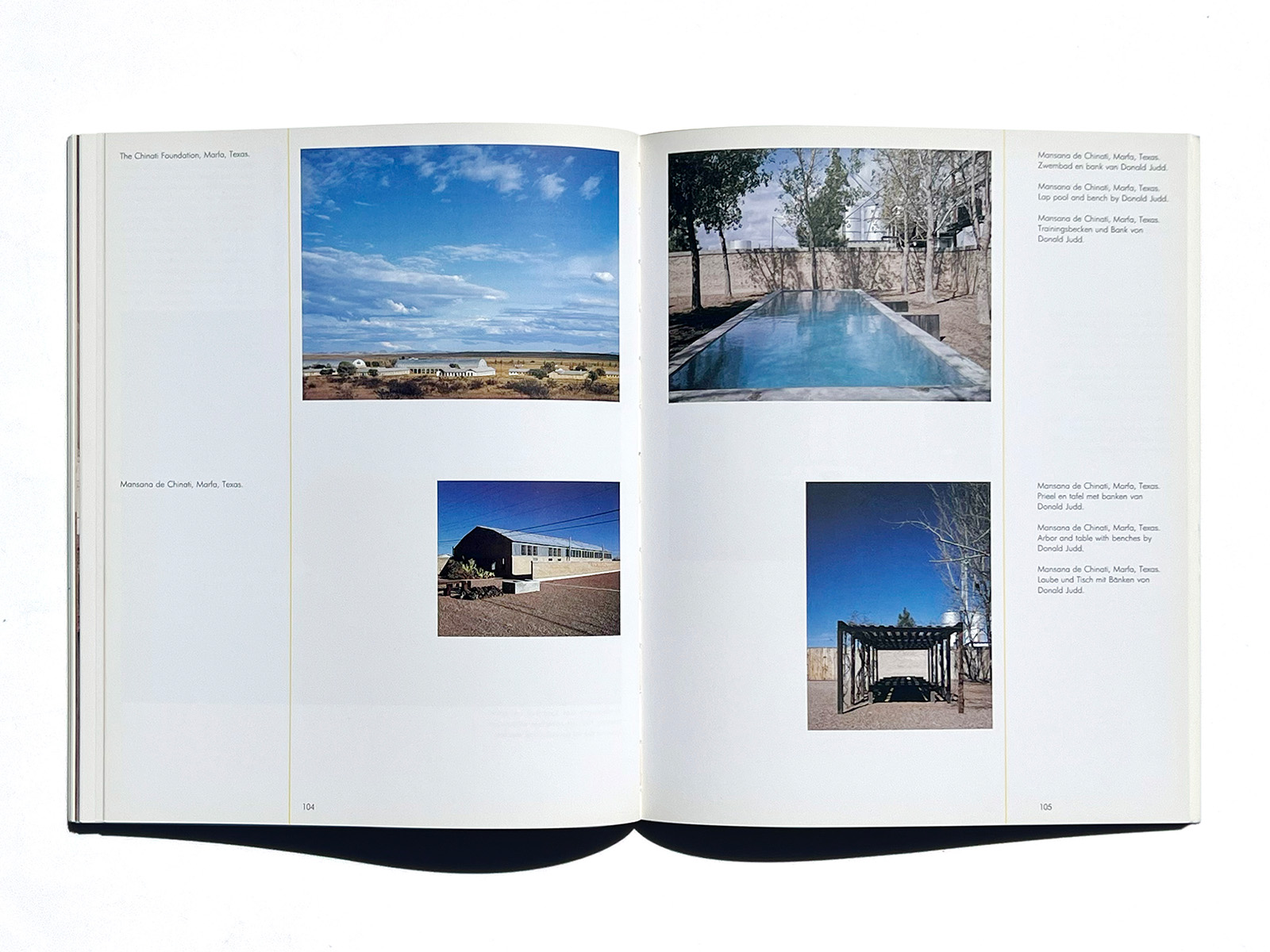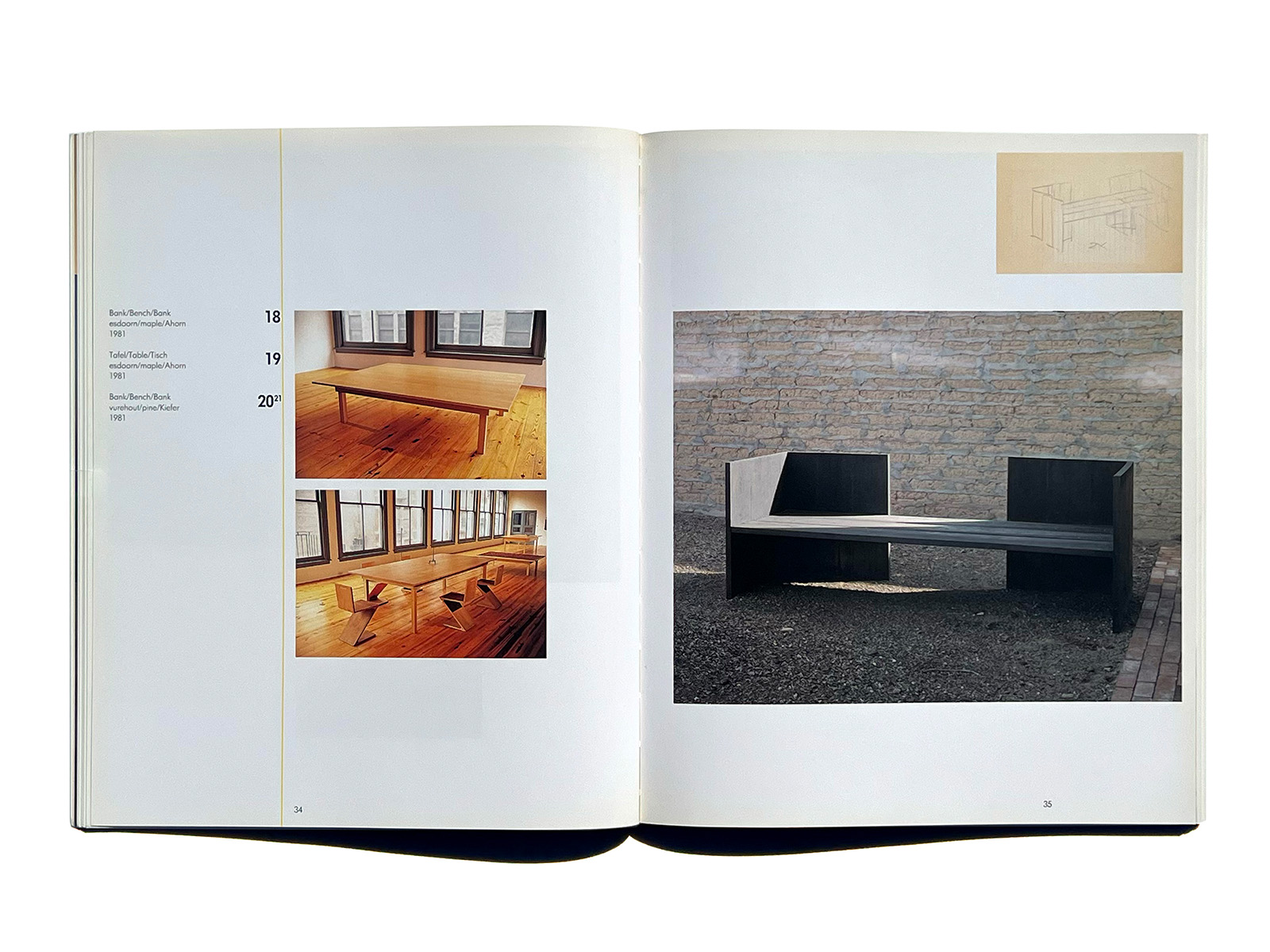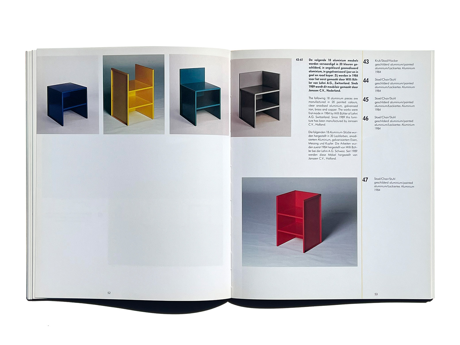 Designed by 8vo, the London-based design studio who—on the recommendation of Wim Crouwel, then director of the Museum Boijmans Van Beuningen—began producing many of the museum’s publications during the 1980s and 1990s, this book was published in 1993 or 1994 in Rotterdam. It provides an overview of Donald Judd’s furniture works and includes the essay “It’s Hard to Find a Good Lamp.” In this essay, Judd recounts the difficulties he faced in finding suitable furniture for his home in Marfa, Texas, which led him to begin designing and making chairs and tables for the first time. He also reflects on the shortcomings of designer furniture, antique furniture, and mass-produced furniture, criticizing the high prices and limited accessibility of well-made pieces, while examining the essential distinctions between good and bad design.