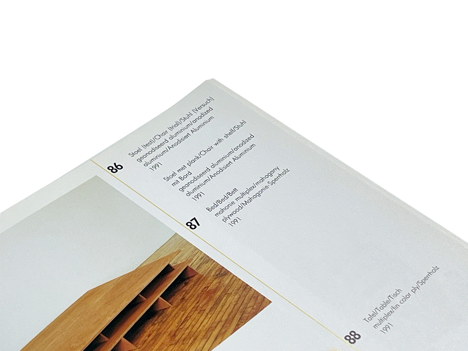 それまでの8voによる多くのBoijmansカタログのデザインでは、Futuraフォントをアイデンティティとし、複数のカラムを動的にずらしたり組み合わせたりするハイコントラストなタイポグラフィとレイアウトが特徴的でした。これに対して、このドナルド・ジャッドの本では、ジャッドのミニマルなグリッドやデザインの思想に深く向き合おうとする8voのデザインスタイルとのせめぎ合いが強く表れています。そのため、本のデザイン自体が内容と同じくらい、デザイナーにとって重要なリファレンスとなっています。