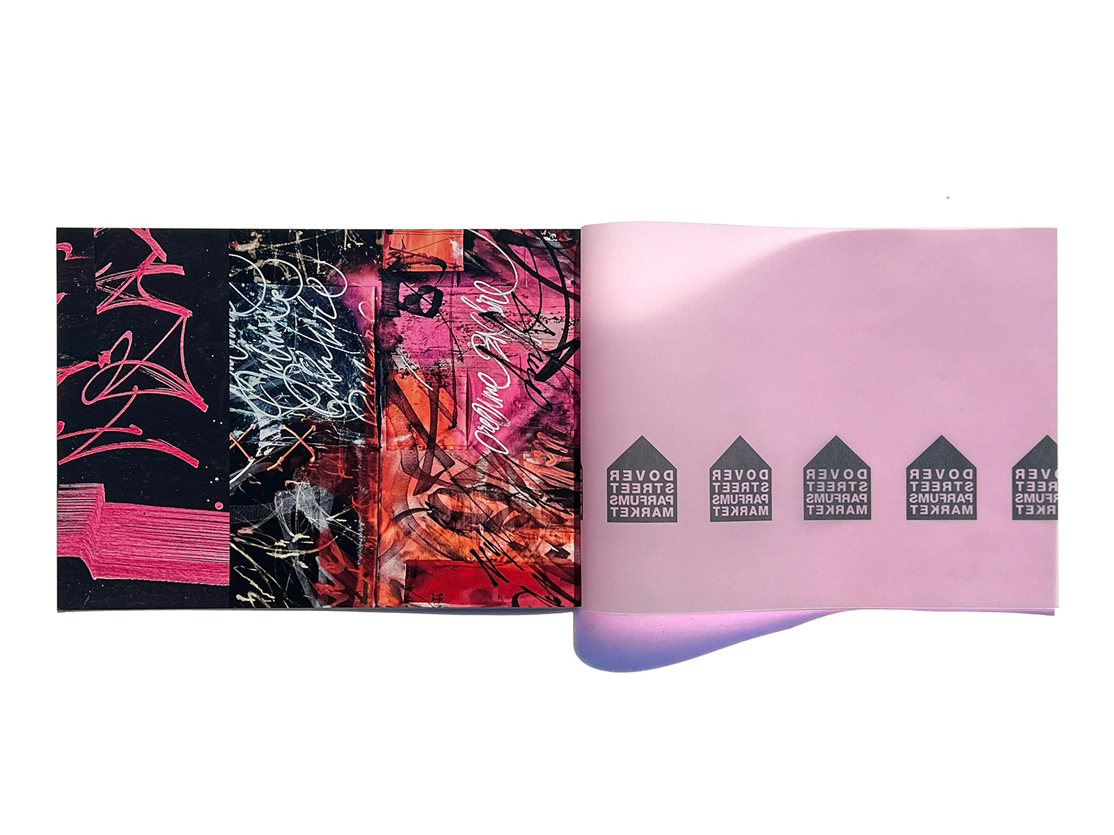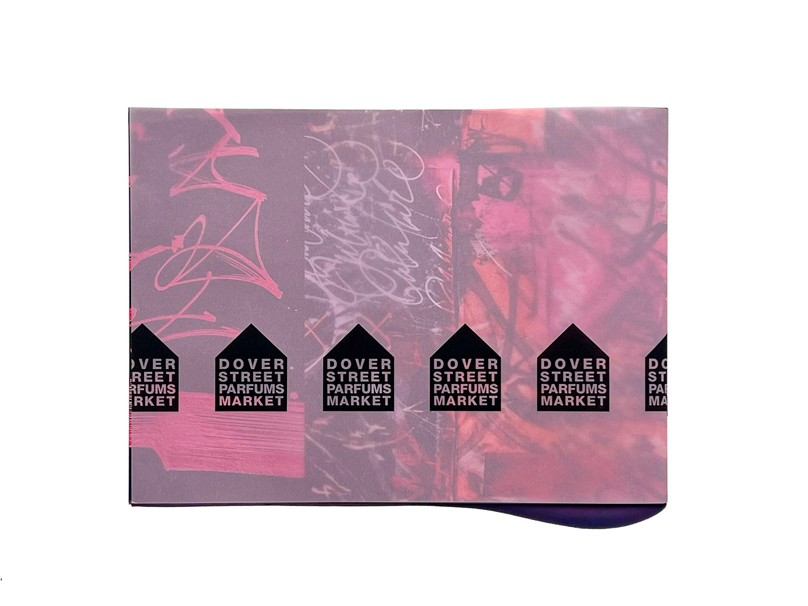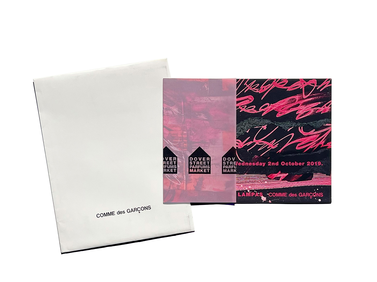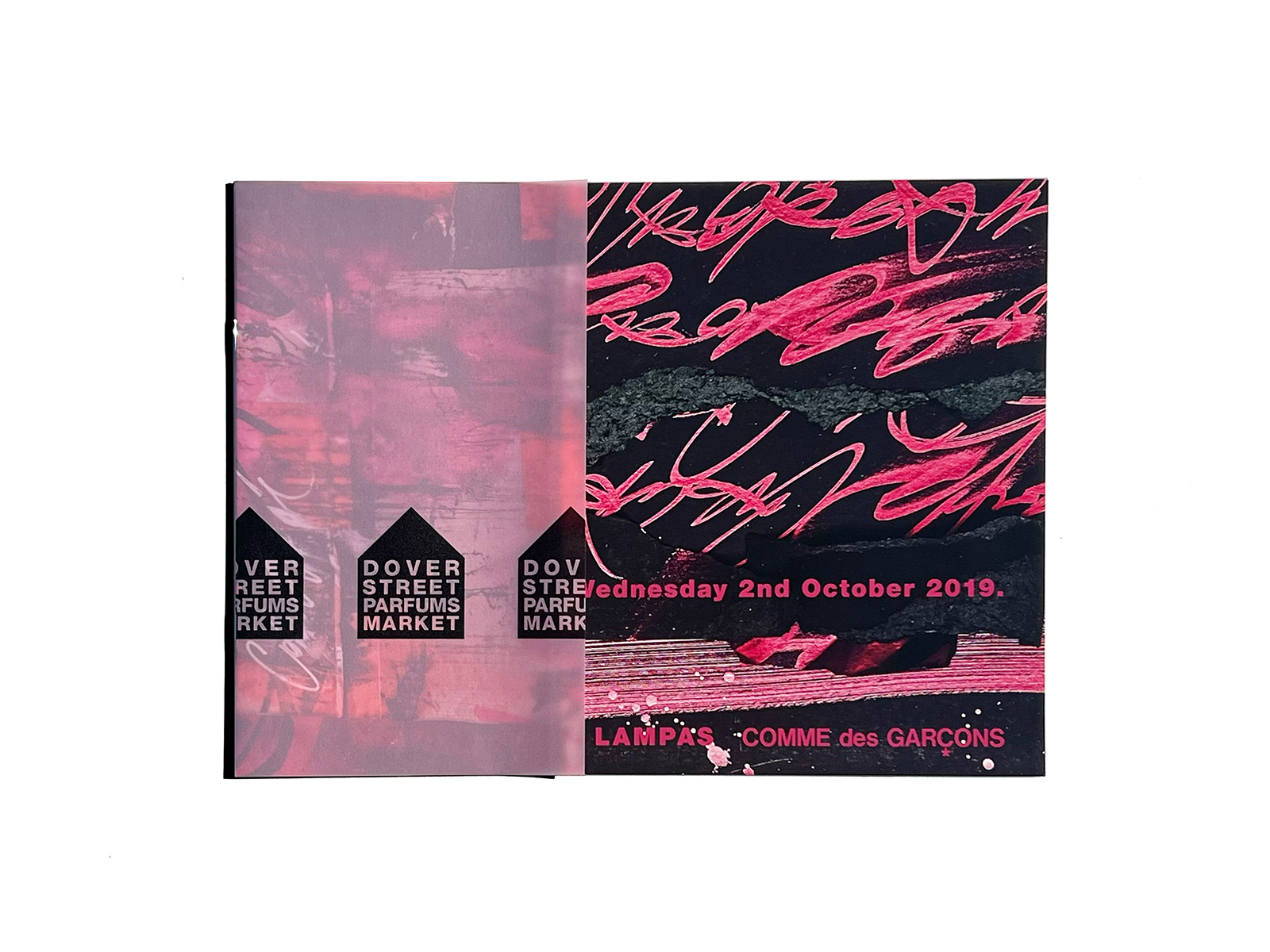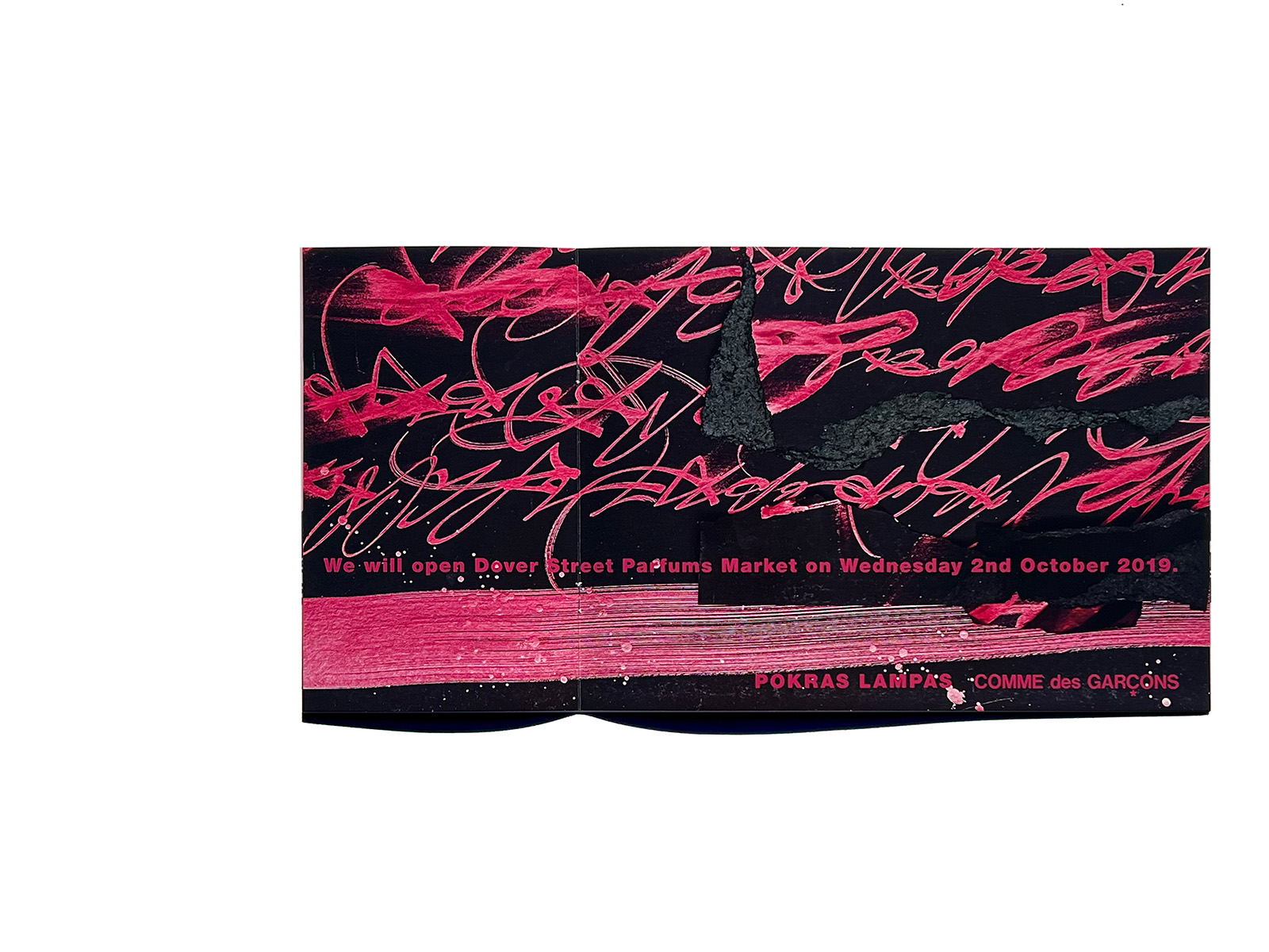 This is a direct mail piece produced for Dover Street Parfums Market, the concept store opened by Comme des Garçons in Paris in 2019. The artwork features Pokras Lampas, an artist known for his distinctive fusion of street-art graffiti and calligraphic forms.