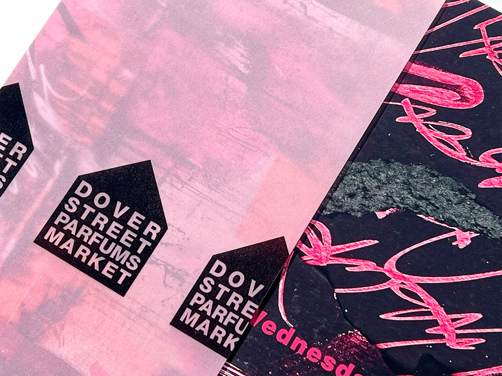 The translucent pale-pink vellum recalls the signature pink window display of Comme des Garçons Parfums, which previously occupied the same location, subtly linking the new store to its earlier visual identity.