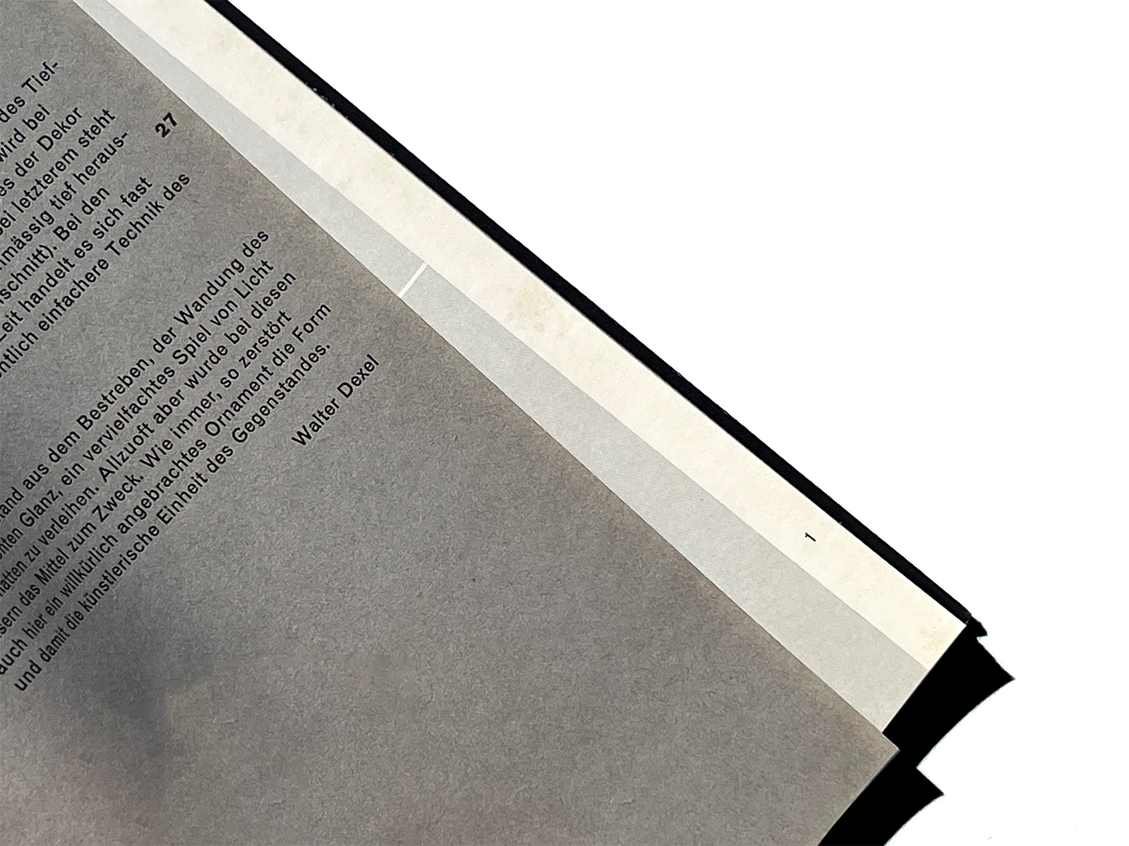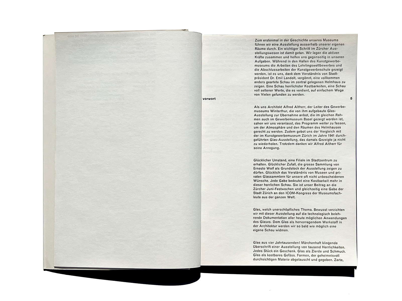 Designed by the Zurich-based Carl B. Graf, it features a striking cover: a photograph of a glass printed on a glassine dust jacket, beneath which the exhibition title—rotated 90 degrees—subtly appears through the semi-transparent layer. It is an elegant and conceptually precise piece of book design.