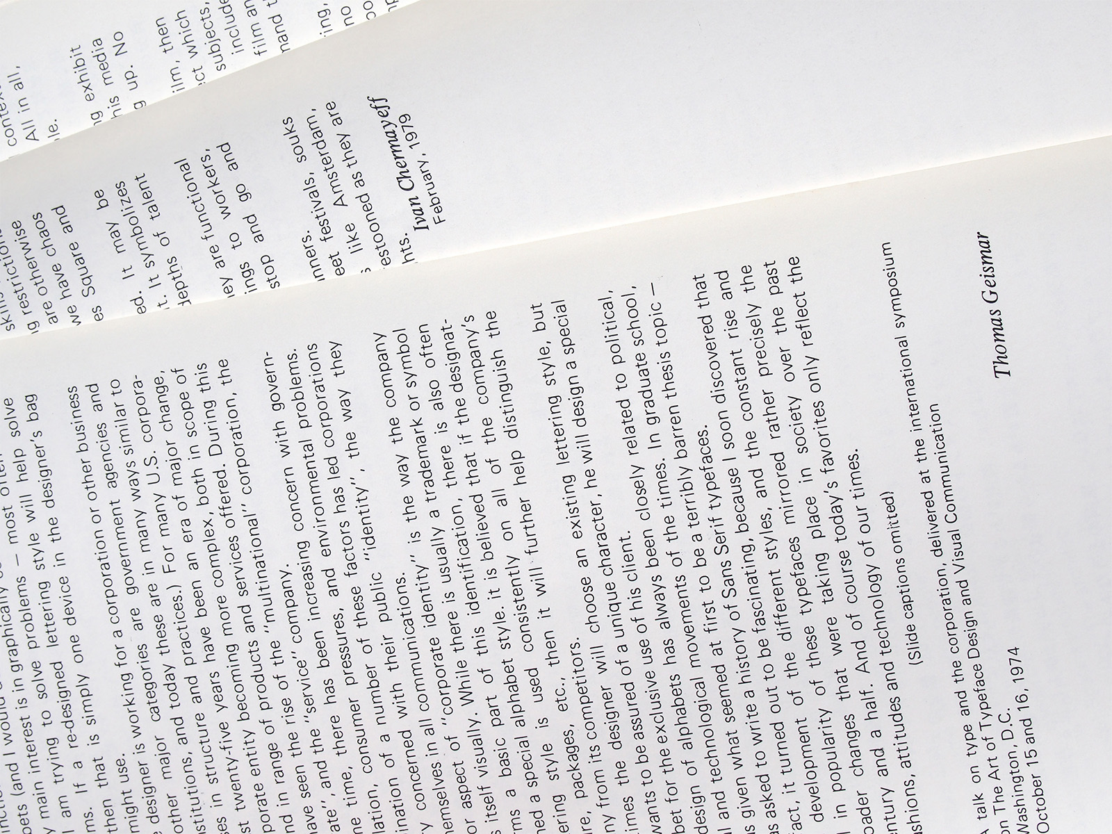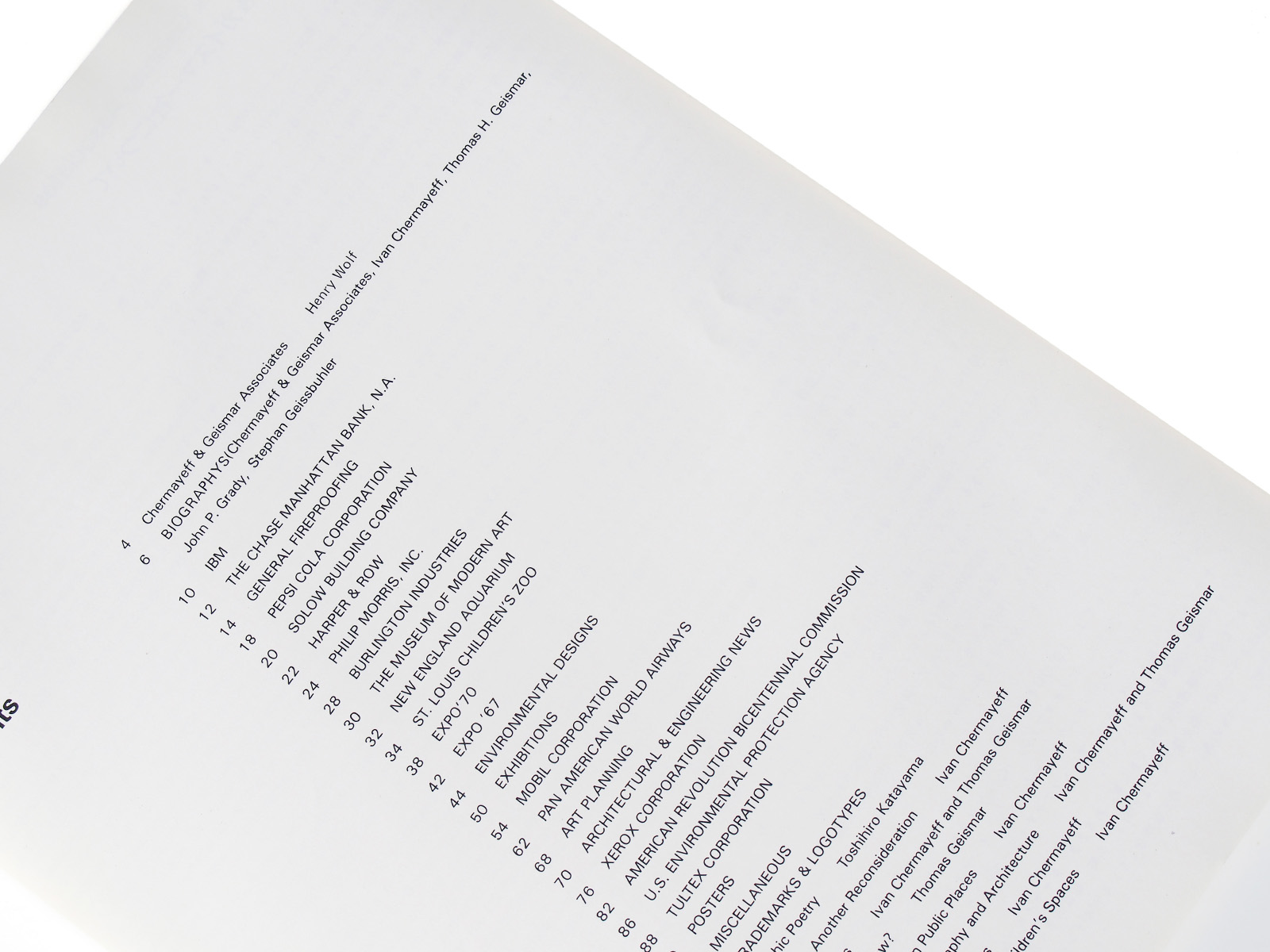 The publication concludes with contributed essays by Ivan Chermayeff and Tom Geismar, addressing topics such as trademarks, graphic design in public space, the relationship between typography and architecture, and the design of spaces for children.