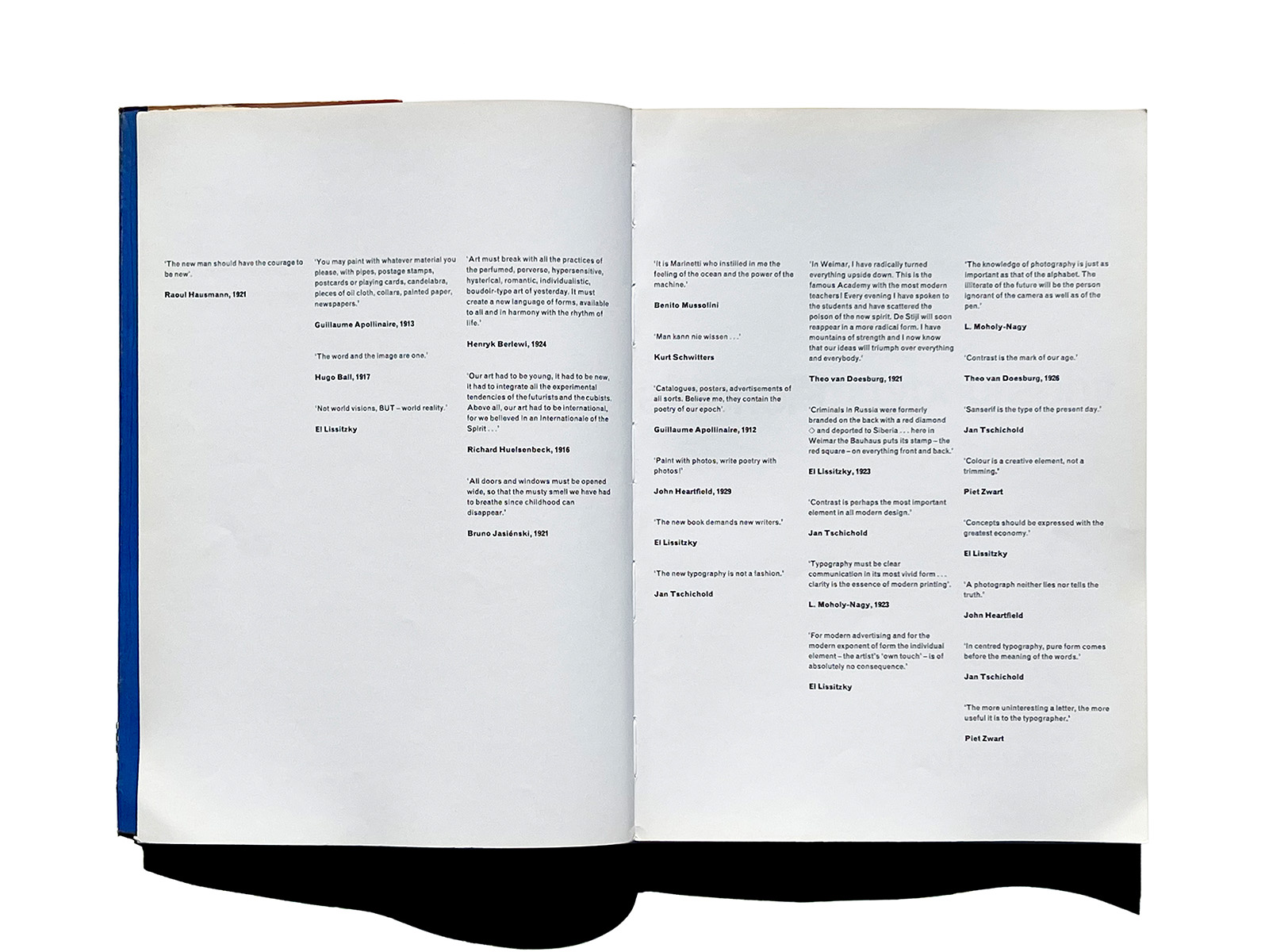 Opening the cover, the book begins with words from legendary figures such as El Lissitzky, H. N. Werkman, Piet Zwart, László Moholy-Nagy, Herbert Bayer, and Jan Tschichold, followed by a carefully composed table of contents.