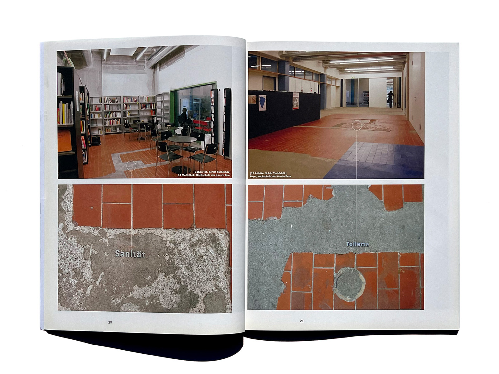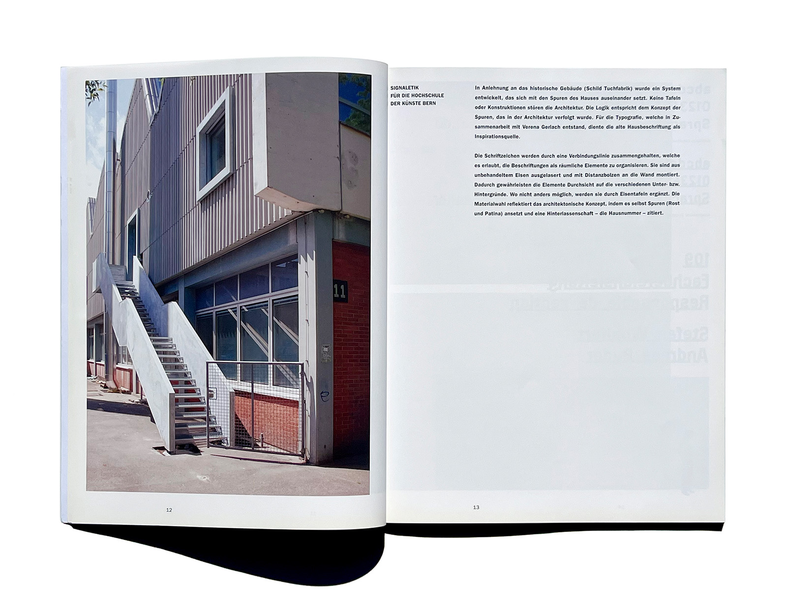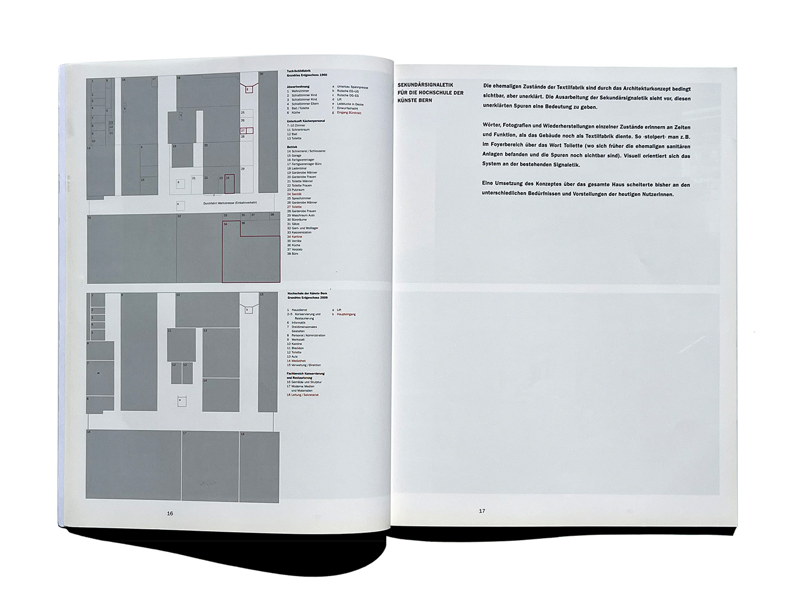 TM issue no. 2 (2009) reconsiders signage not merely as a functional tool for orientation, but as a device for reading the history and meaning of architecture. The project is situated in a former factory building used by Bern University of the Arts (BUA), where layers of past functions and time overlap.