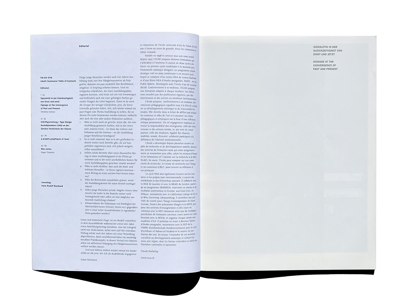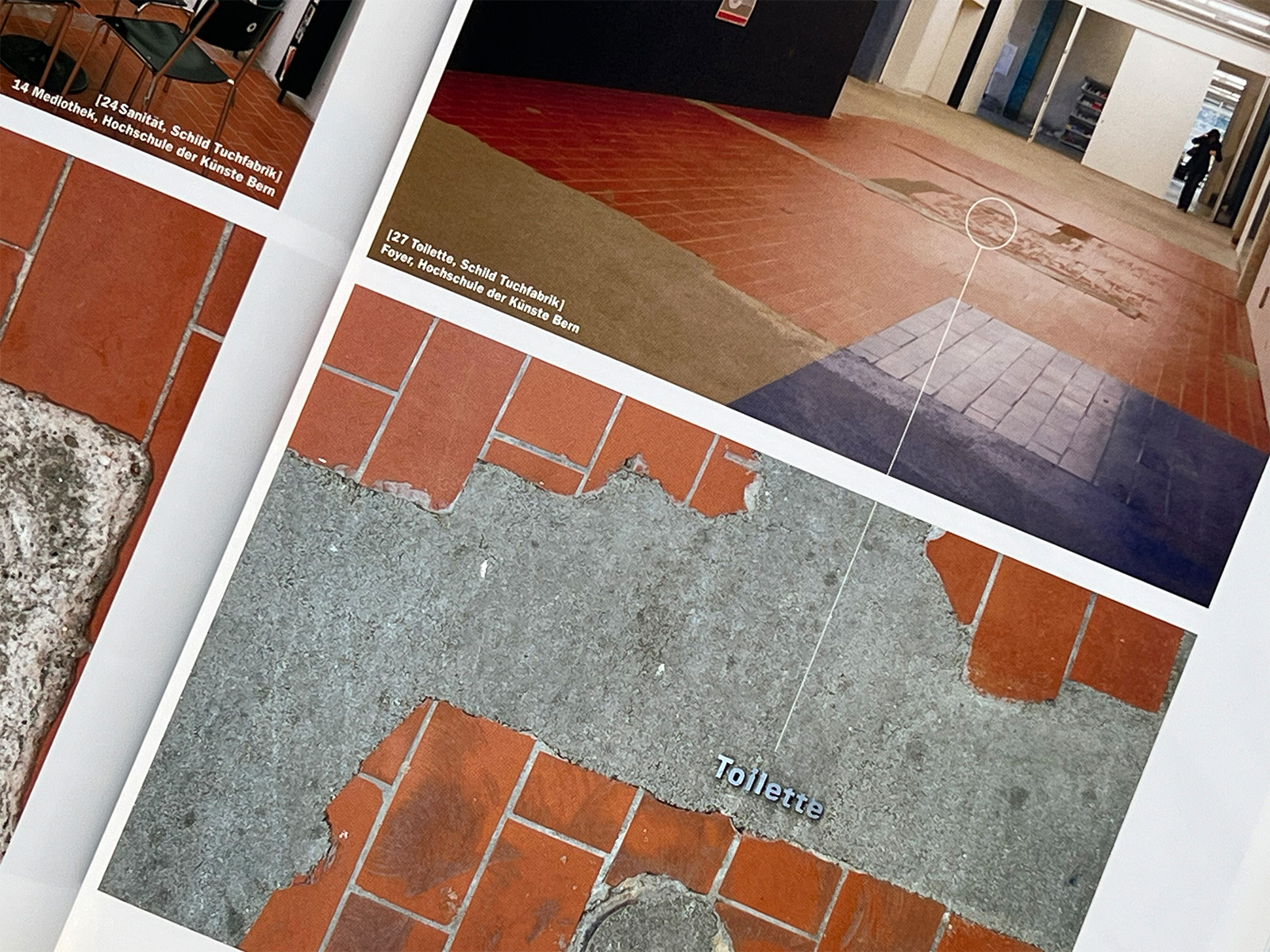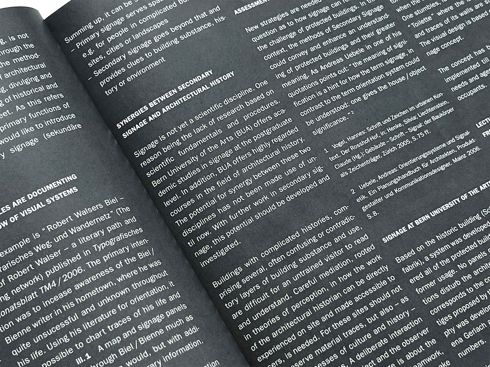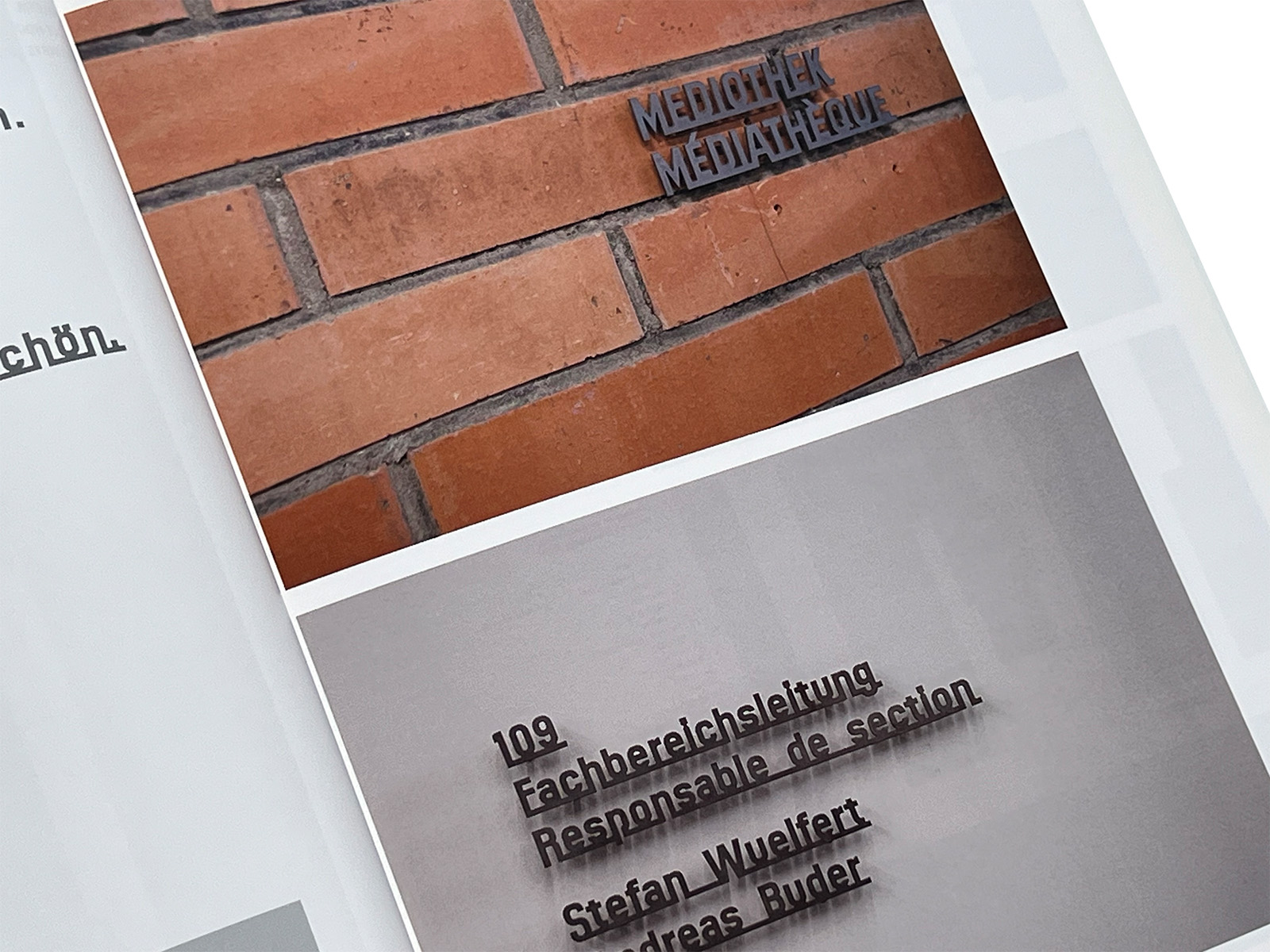 TM issue no. 2 (2009) reconsiders signage not merely as a functional tool for orientation, but as a device for reading the history and meaning of architecture. The project is situated in a former factory building used by Bern University of the Arts (BUA), where layers of past functions and time overlap.
