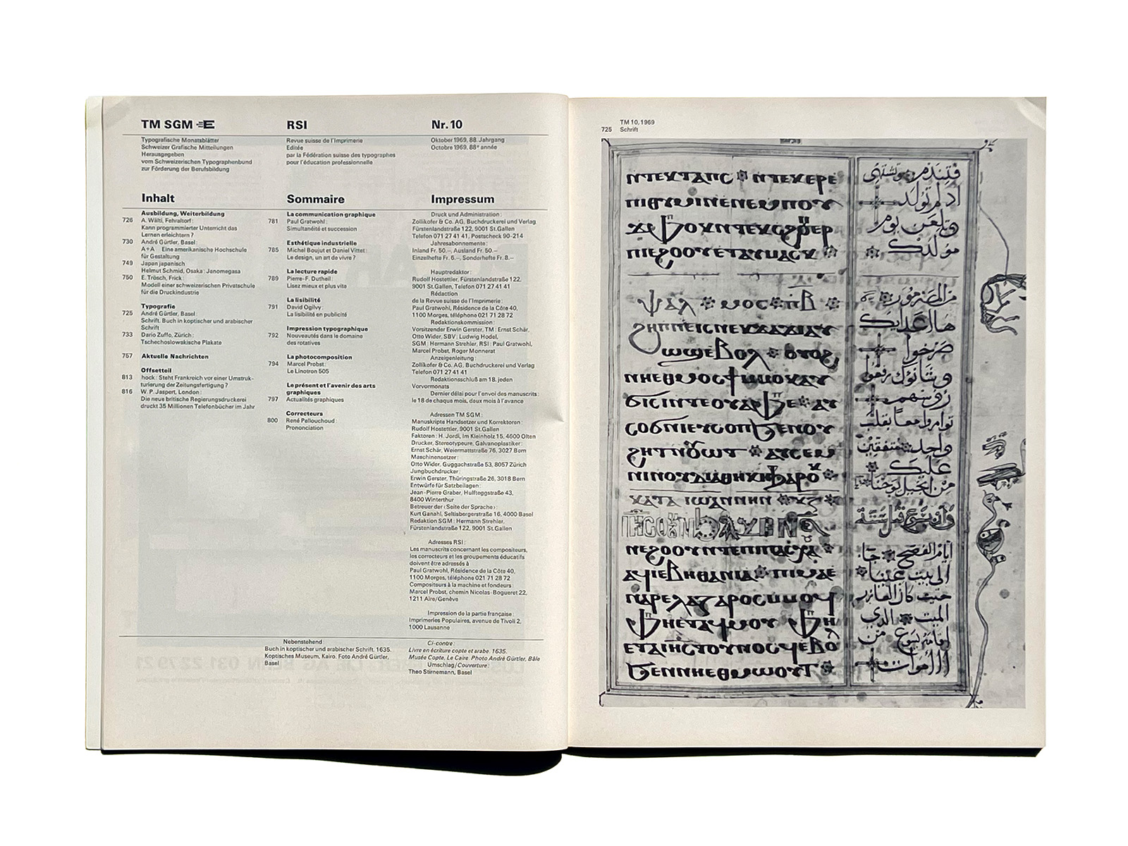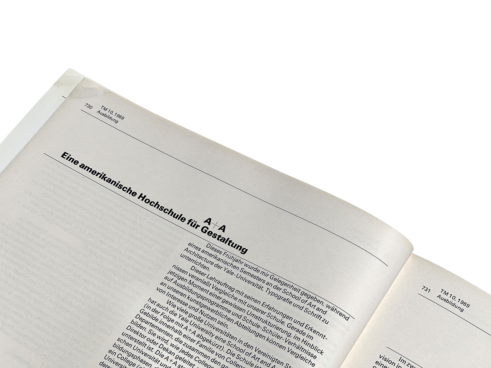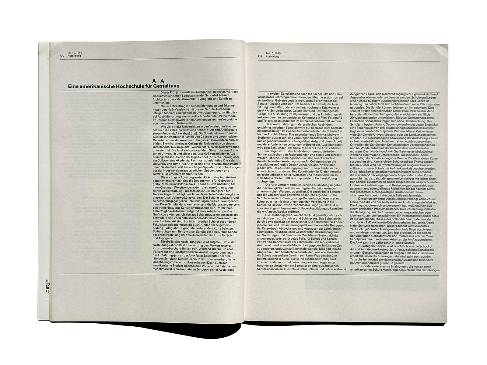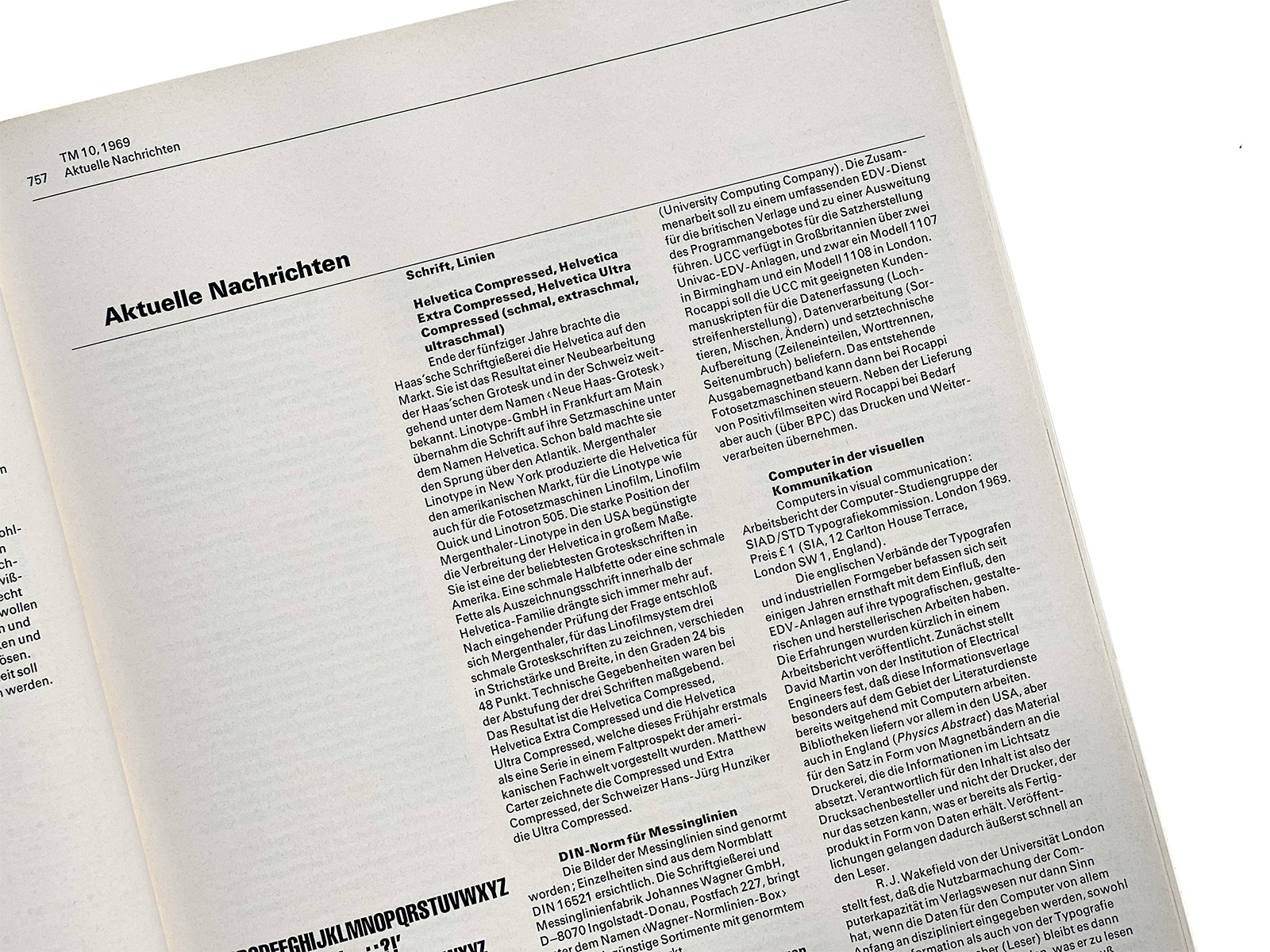 Typographische Monatsblätter (Typographic Monthly Sheets), TM, was founded in 1933 by the ‘‘Schweizerischer Typographenbund, Bern’’ (Swiss Typographic Society, Bern).