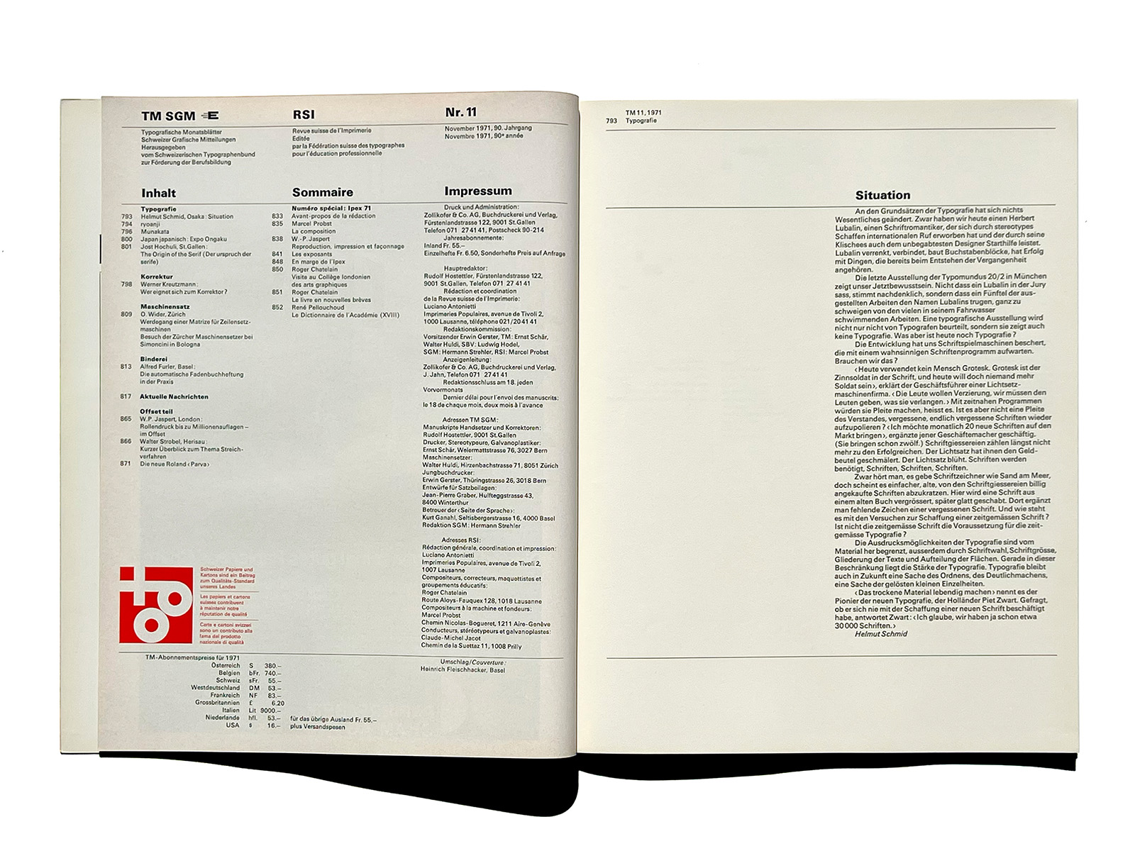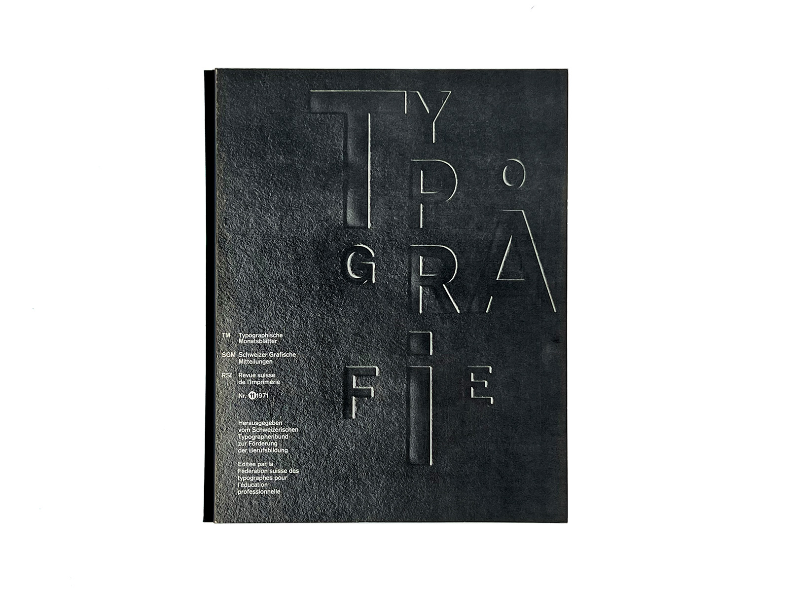 Typographische Monatsblätter (Typographic Monthly Sheets), TM, was founded in 1933 by the ‘‘Schweizerischer Typographenbund, Bern’’ (Swiss Typographic Society, Bern).