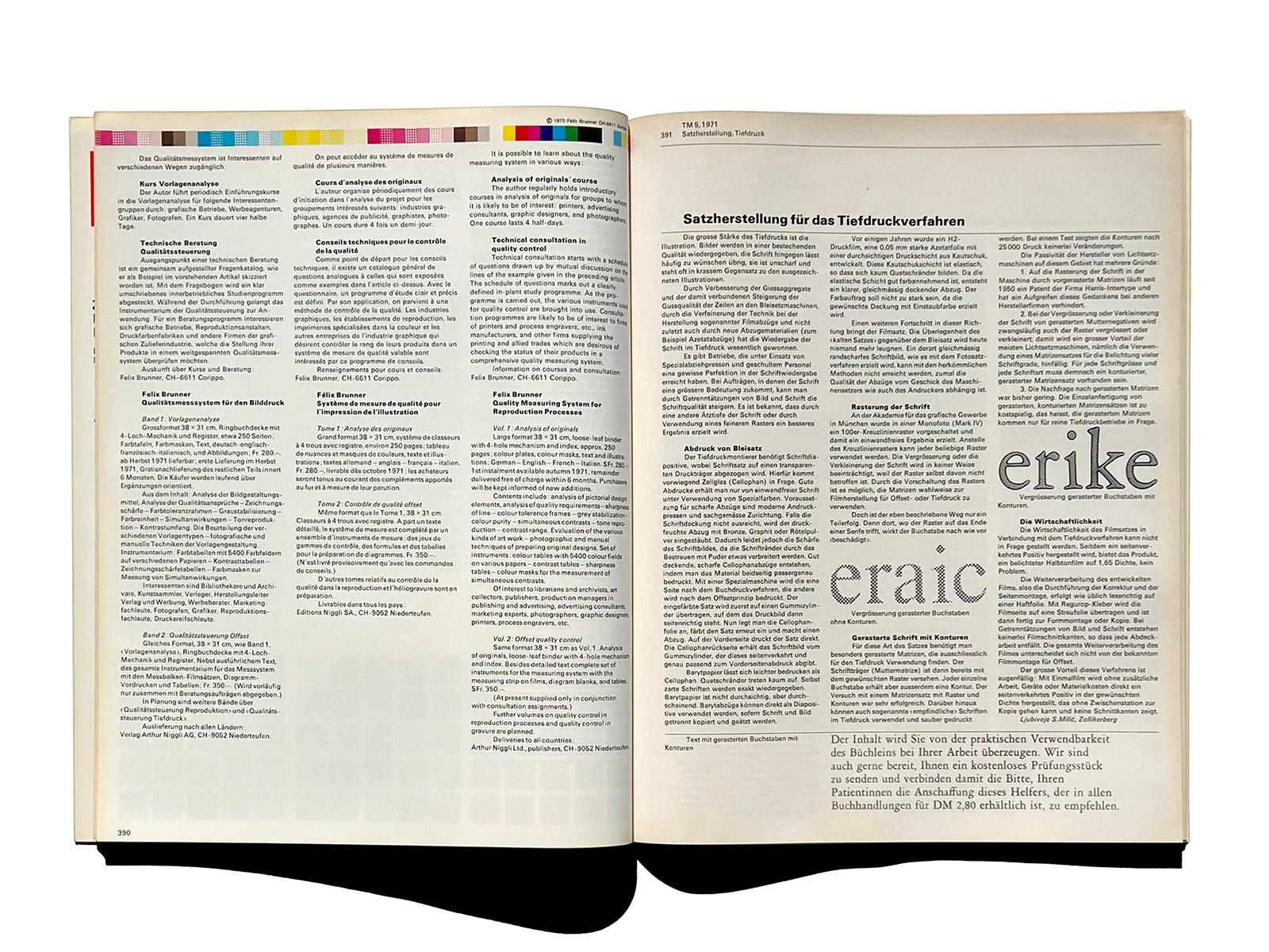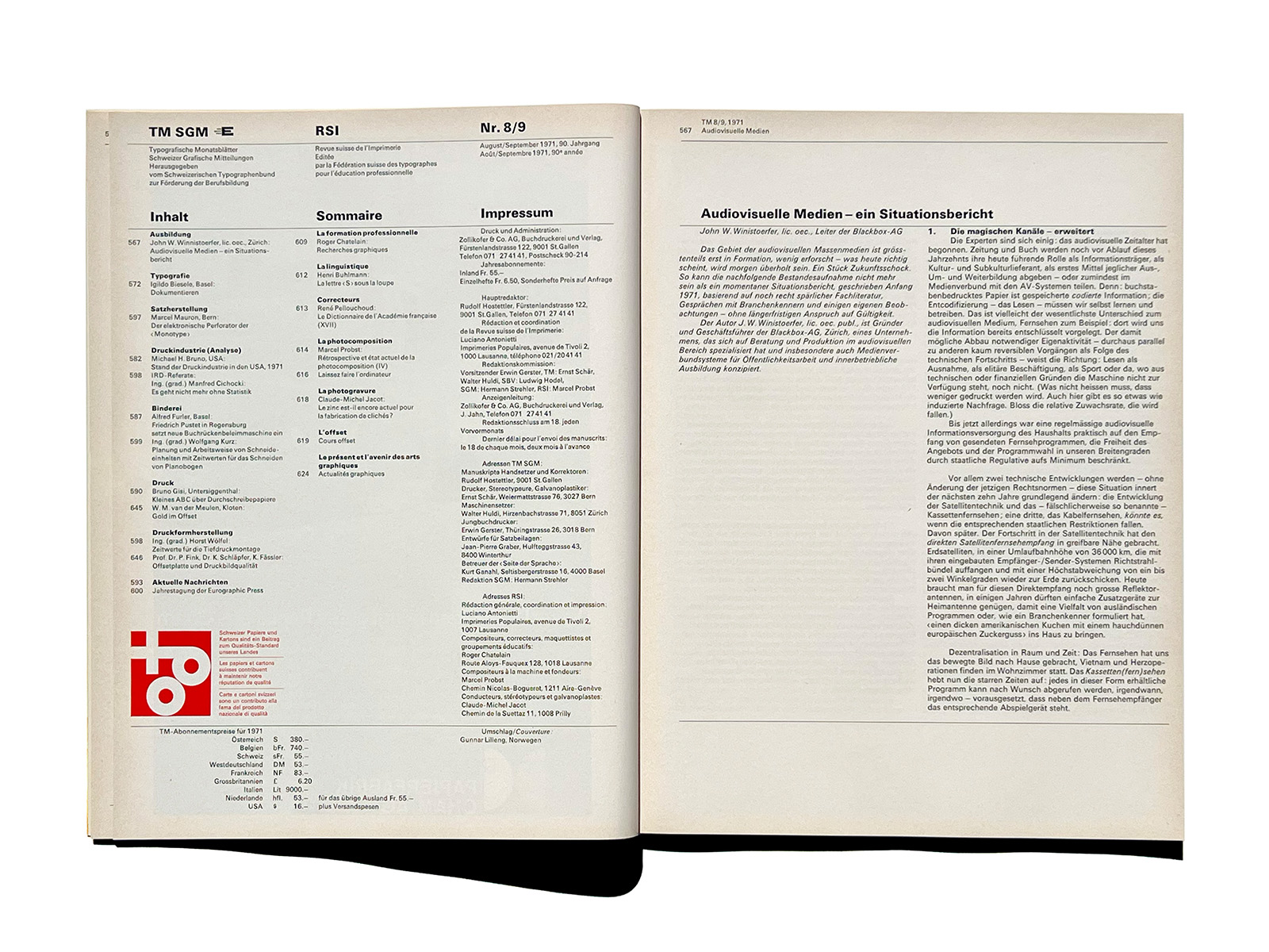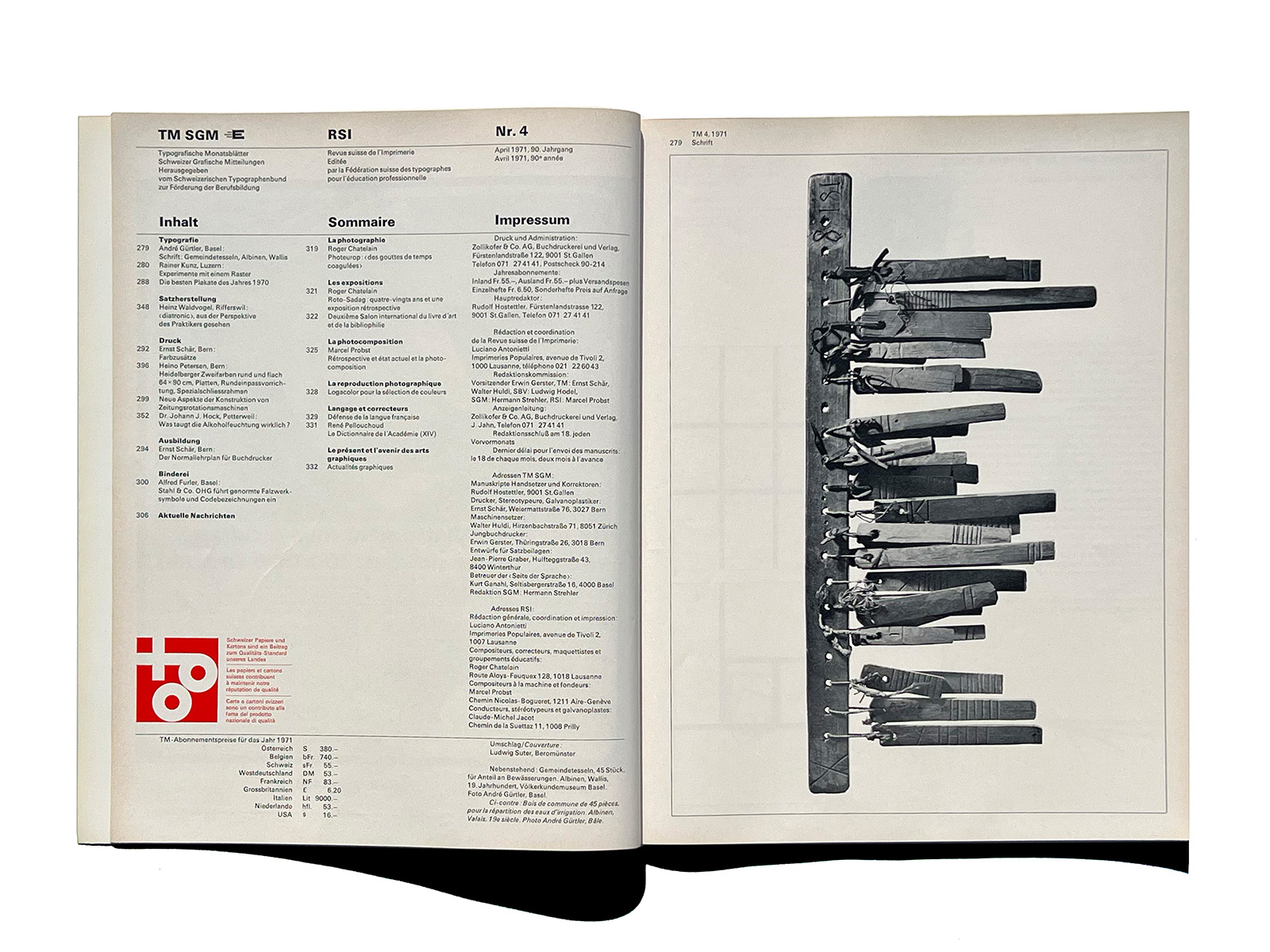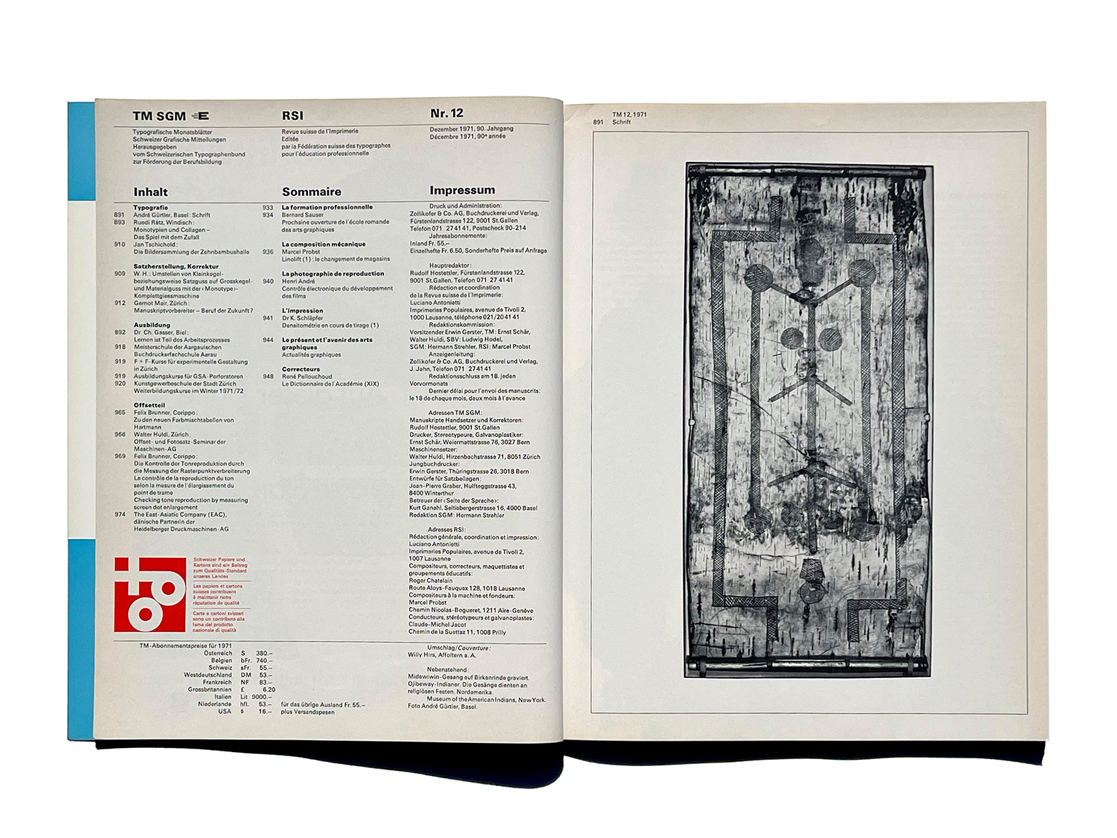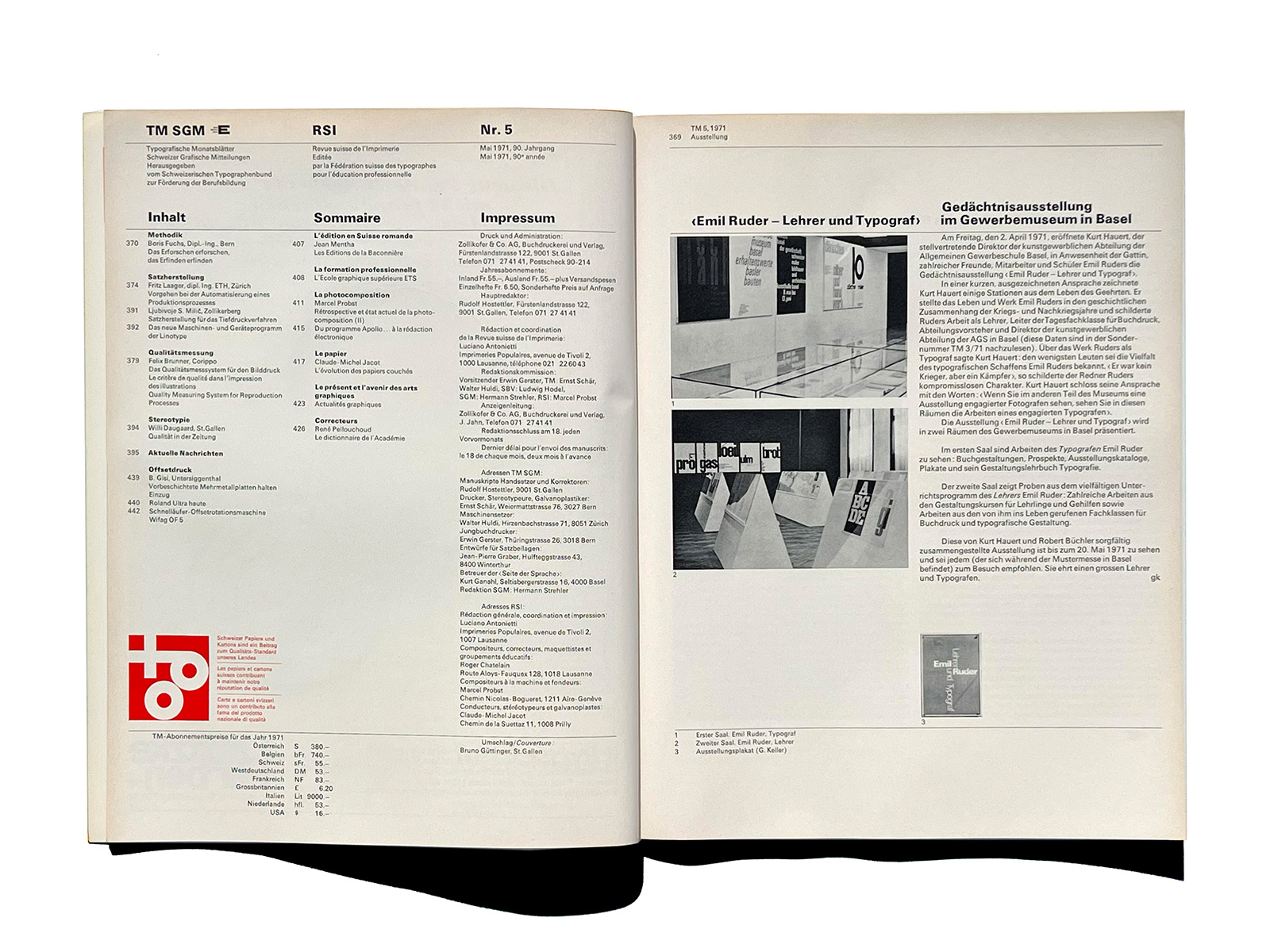 1948年、TMはフランスとスイスの雑誌『Revue suisse de l’Imprimerie』(スイス印刷ジャーナル)RSIと合併しました。 1923年、エミール・グッジによりローザンヌで創刊。名称は「スイス印刷・関連産業ジャーナル」(Revue suisse de l’Imprimerie et des Industries annexes)です。