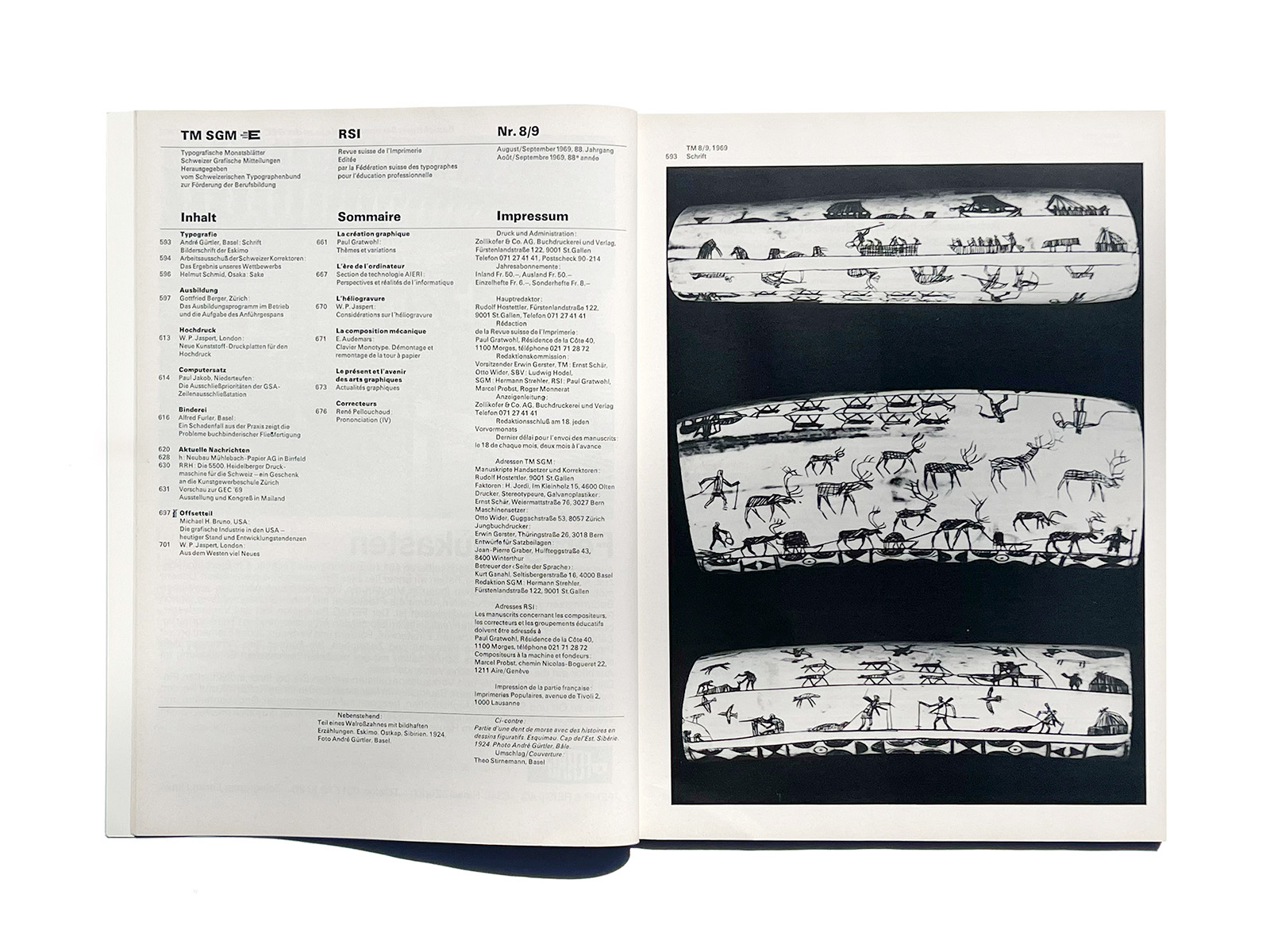 In 1948, TM merged with the French-Swiss magazine ‘‘Revue suisse de l’Imprimerie’’ (Swiss Printing Journal), RSI. Founded in 1923 by Emile Guggi, Lausanne, under the name ’‘Revue suisse de l’Imprimerie et des Industries annexes’’ (Swiss Journal of Printing and Related Industries).