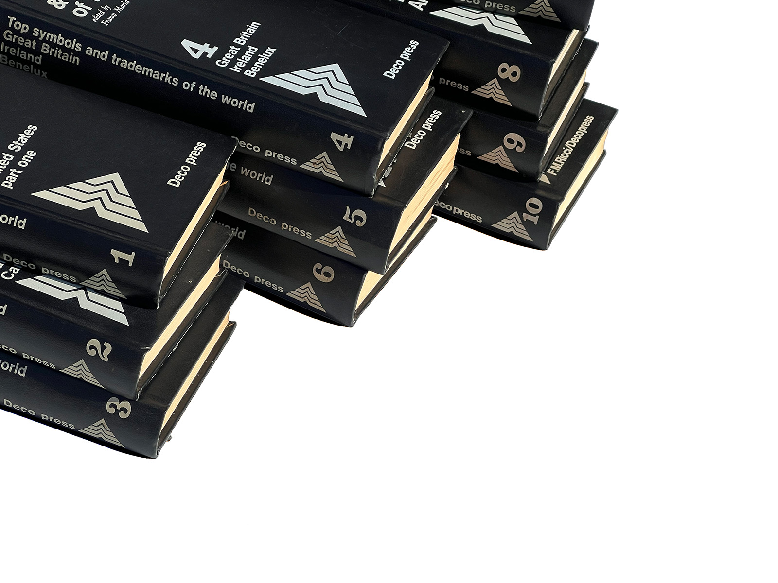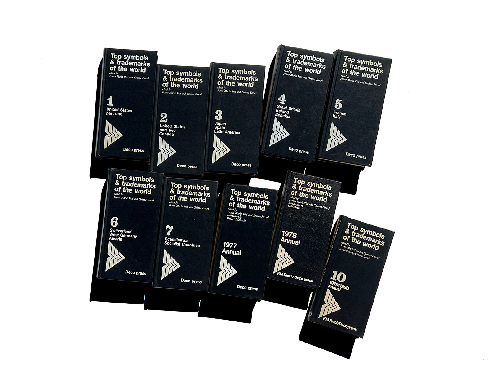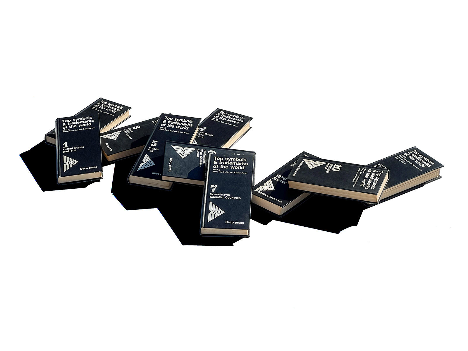This is a semi-complete set of World Symbols and Trademarks, published in 1973, containing Volumes 1 through 10 of the full eleven-volume series (Volume 11 not included). Each volume presents a beautifully curated selection of notable logo designs from the United States, Canada, Switzerland, Germany, the Scandinavian countries, and even various socialist states. With roughly 700 logos included in each book—amounting to nearly 7,000 examples across the ten volumes—the set offers an extensive and unparalleled survey of international identity design.