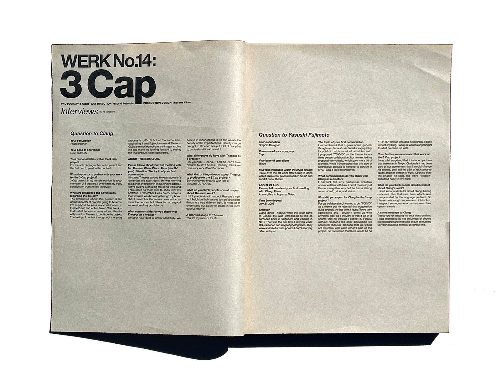 The 14th issue of the Singapore-based visual magazine WERK continues the publication’s tradition of distinctive collaborations, led by graphic designer Theseus Chan and art director Marina Lim, with companies such as Comme des Garçons and artists from around the world. For this issue, art direction was handled by Yasushi Fujimoto of Cap, with photography by John Clang and production by Theseus Chan. The result pushes the possibilities of magazine-making even further, with its striking cover design that appears to be boldly torn.