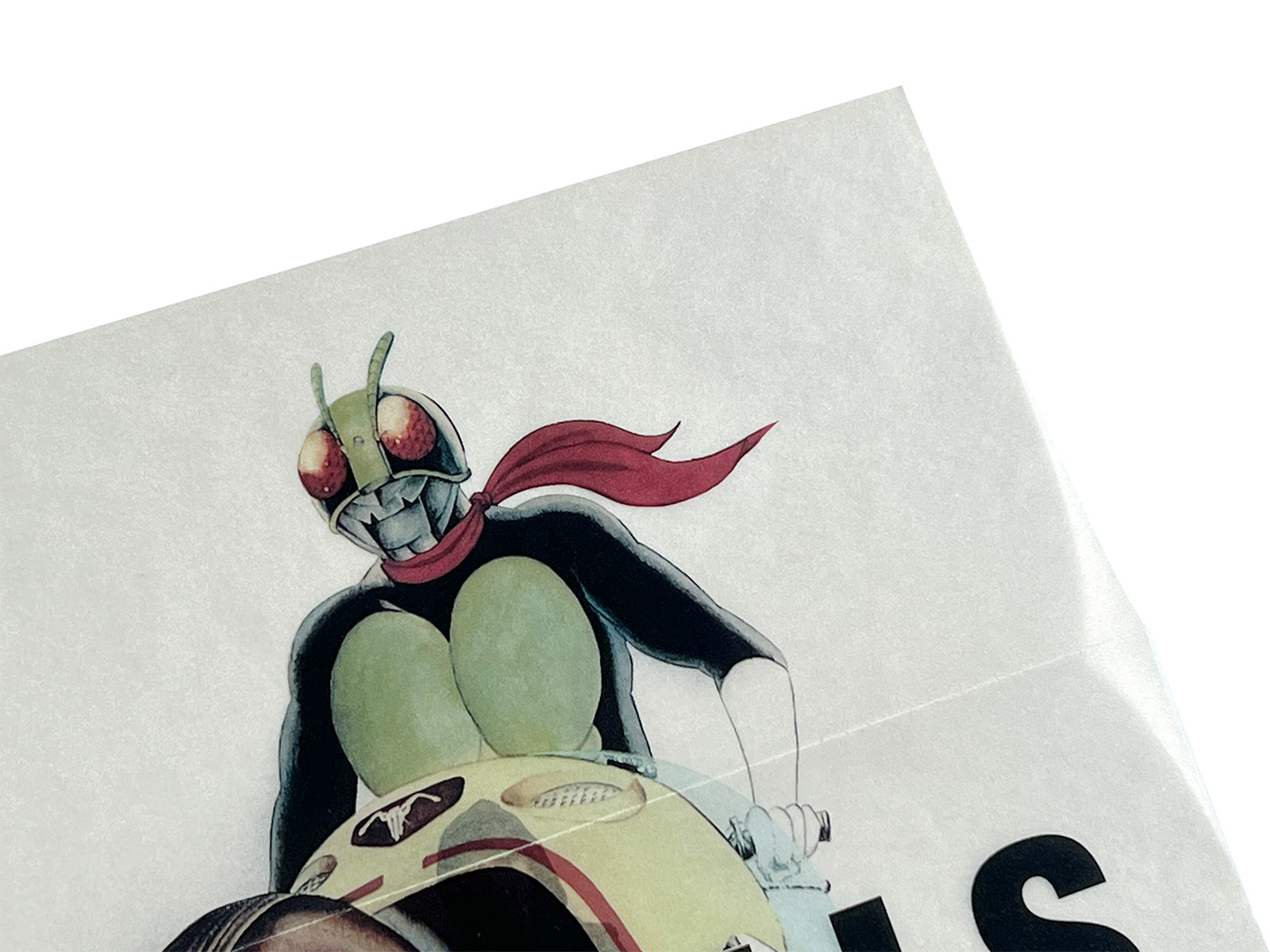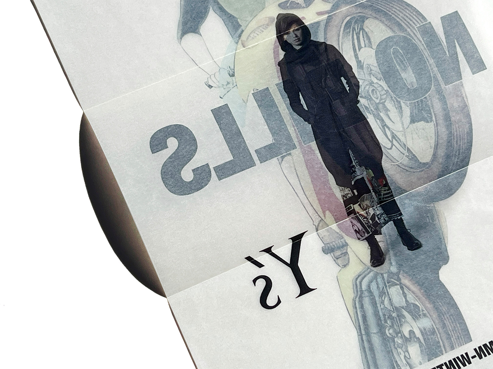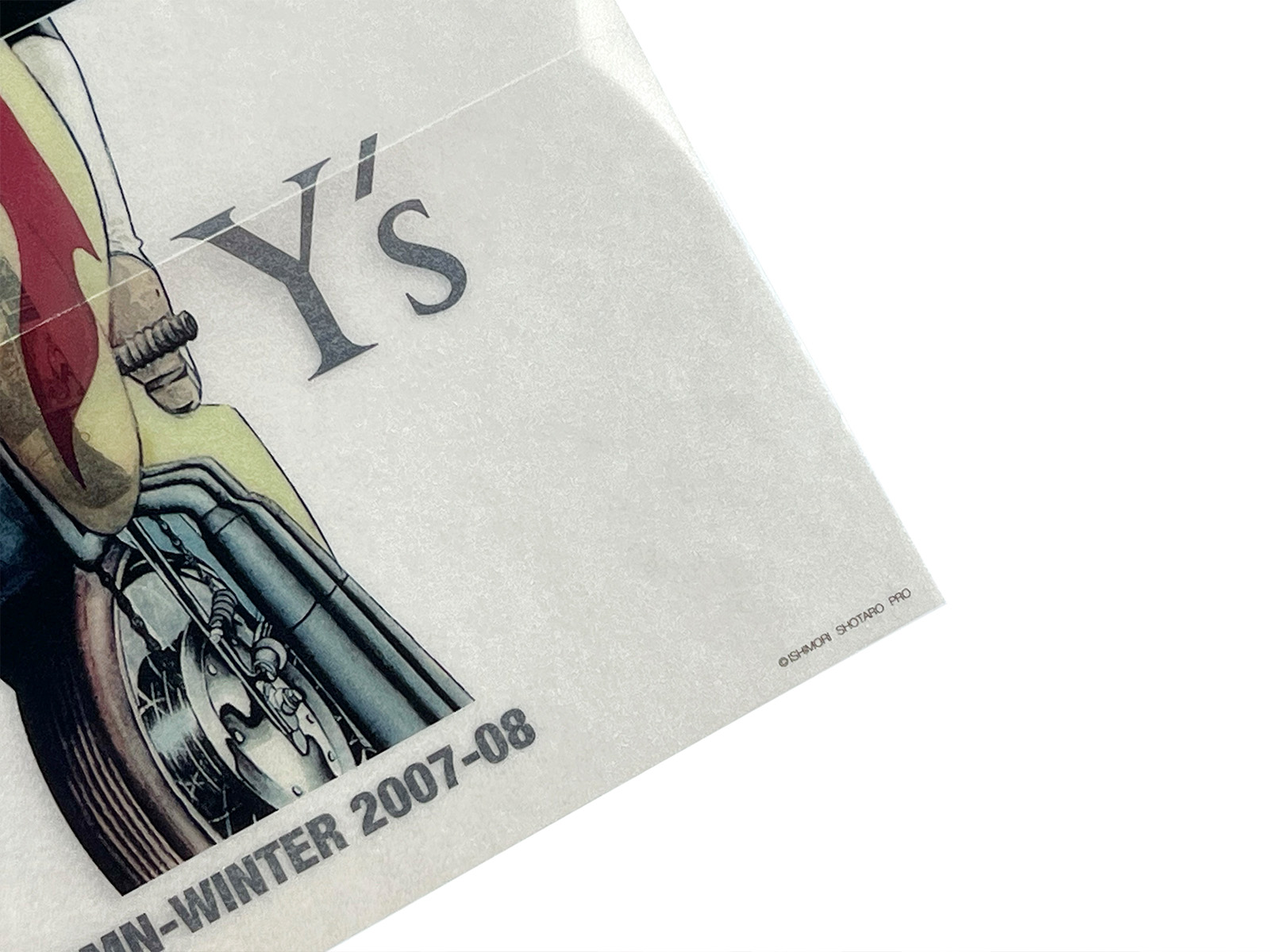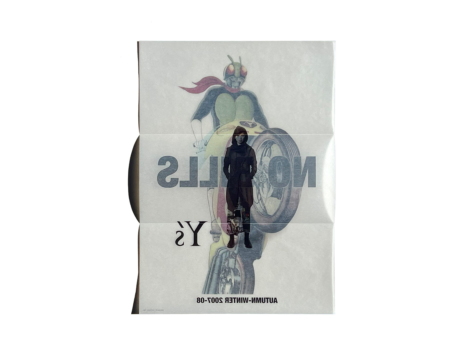 Printed on glossy tracing paper, the front features Kamen Rider, one of Ishinomori’s most representative characters, while the reverse is printed with the Y’s logo and a photograph of a person styled in the collection’s garments.